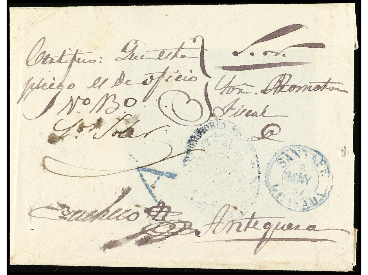 ESPAÑA: PREFILATELIA. 1857. A ANTEQUERA. Marca A (P.E. 3 var.) en color azul. No catalogada en este color. Gran rareza. (Image1) (Image2)