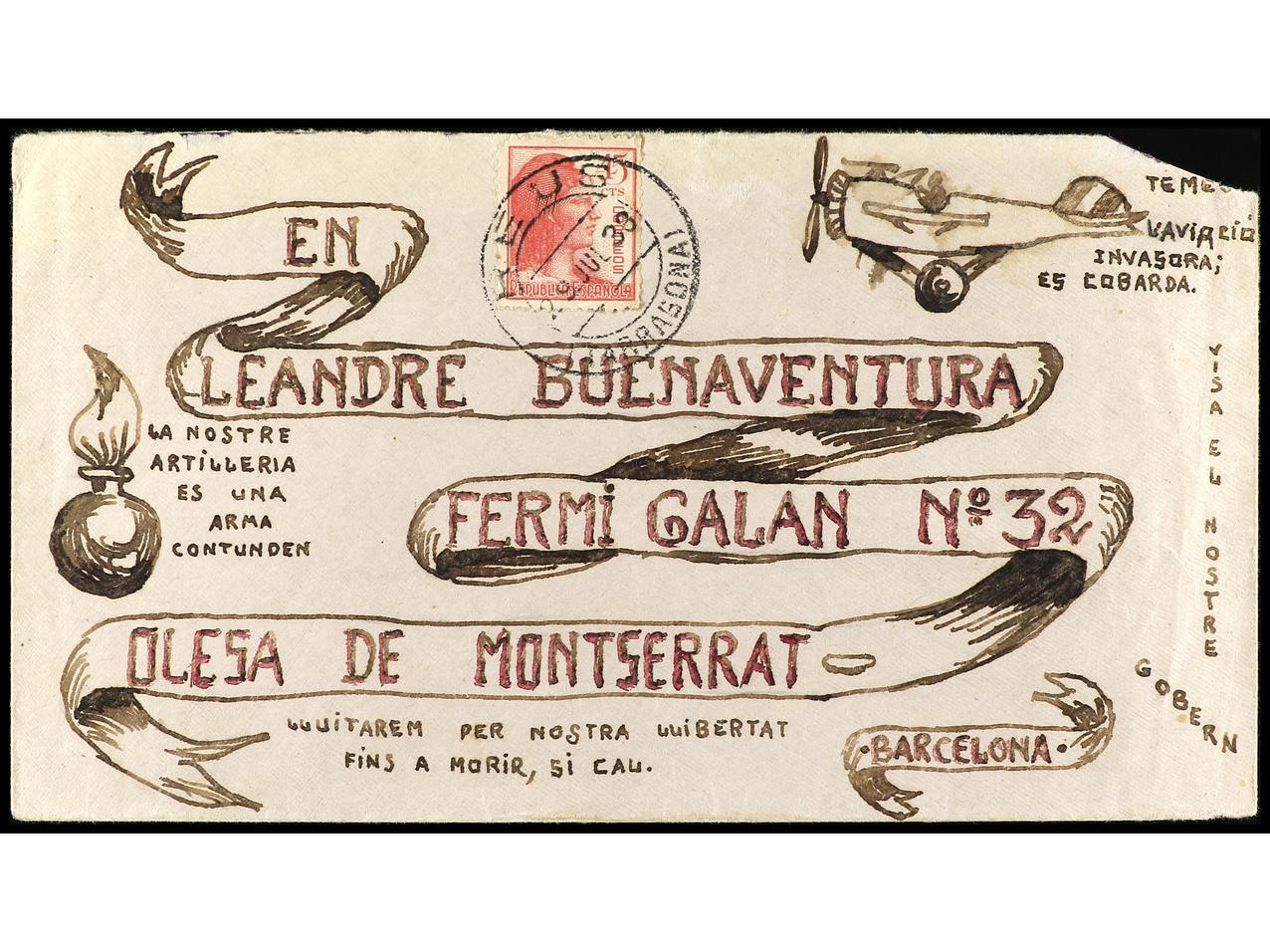 ESPAÑA GUERRA CIVIL. 1938. REUS a OLESA. Sobre enviado por un militar con ilustraciones a mano con proclamas patrióticas. ESPECTACULAR y RARO.