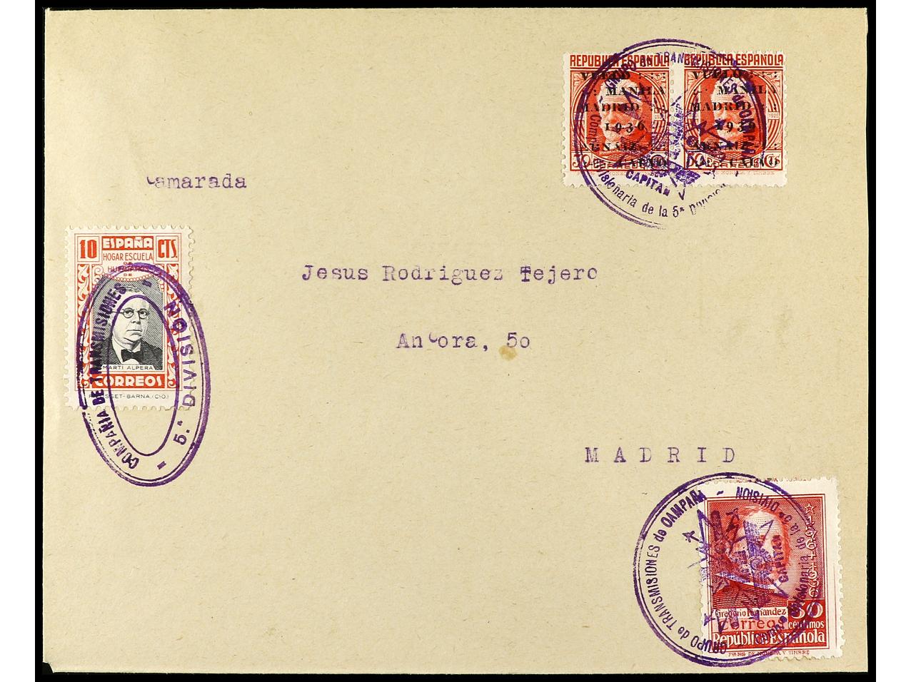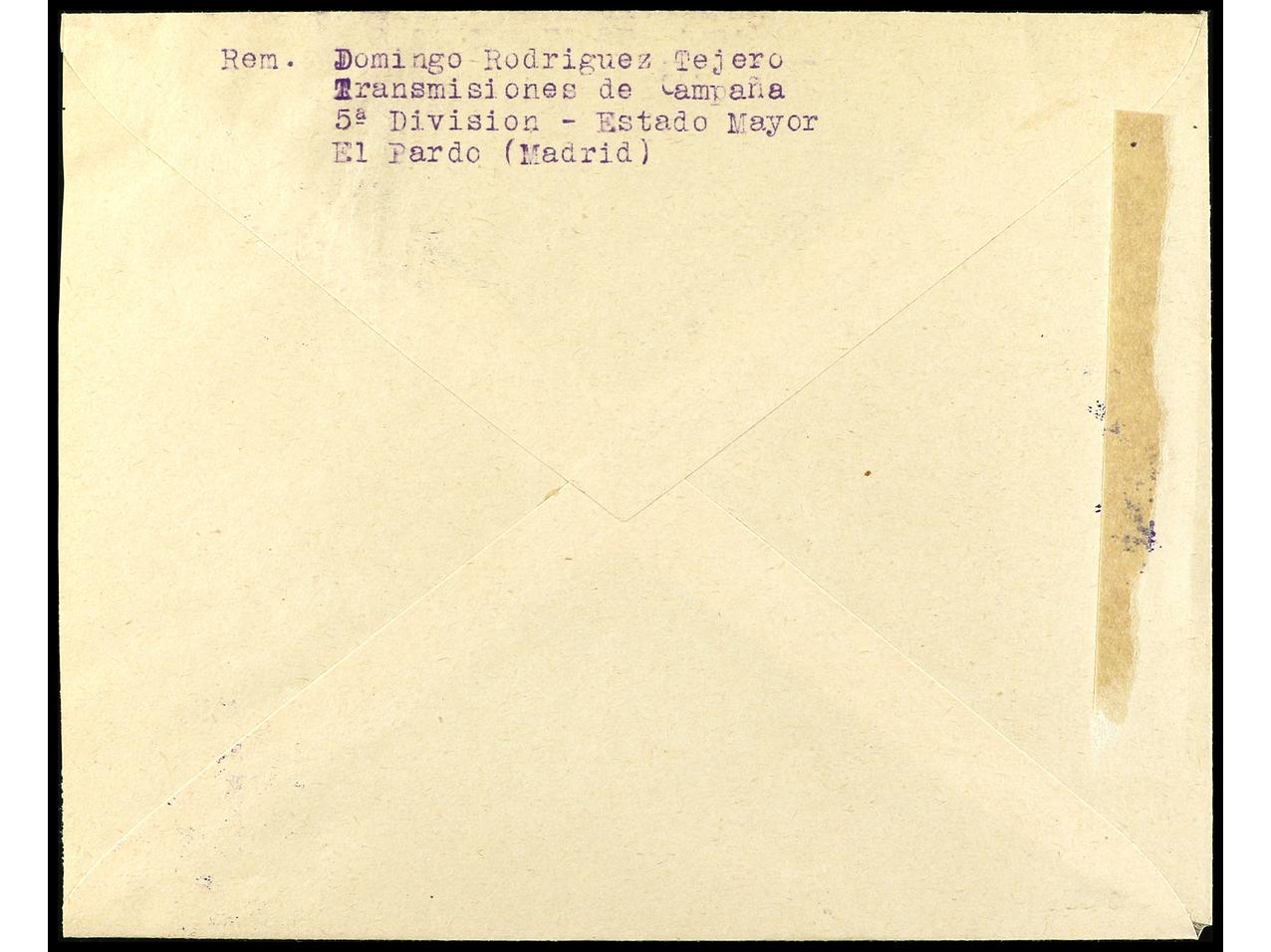 ESPAÑA GUERRA CIVIL. (1938 ca.). EL PARDO (Madrid) a MADRID. 30 cts. (3) y sello de Beneficencia de 10 cts. mat. GRUPO DE TRANSMISIONES DE CAMPAÑA de la 5ª División. PRECIOSA. (Image1) (Image2)