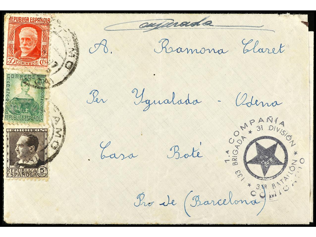 ESPAÑA GUERRA CIVIL. 1937. SASA DE ABADIANO (Huesca) a BARCELONA. Sobre con el texto circulado sin sellos de 5 cts., 10 cts. y 30 cts. matasellados en Siétamo. Marca 1ª COMPAÑÍA/133 BRIGADA/31 DIVISION/3er BATALLON. RARA. (Image1) (Image2)
