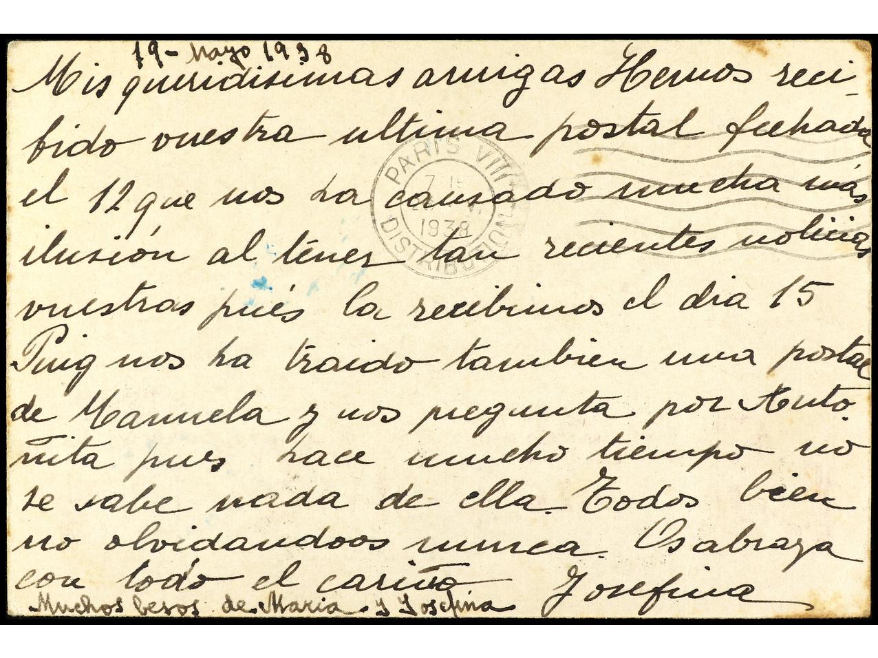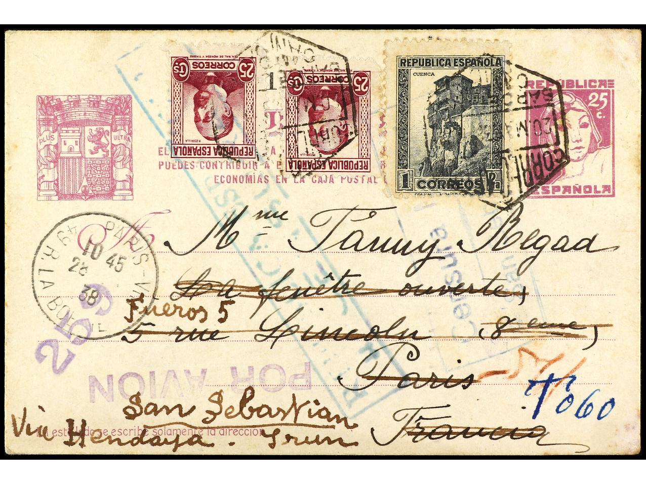 ESPAÑA GUERRA CIVIL. 1938. BARCELONA a PARÍS y reexpedida a SAN SEBASTIÁN. Entero Postal de 25 cts. lila con franqueo adicional de 25 cts. (2) y 1 pta. Tasada a la llegada con 60 cts. Muy interesante uso entre la zona republicana y la
