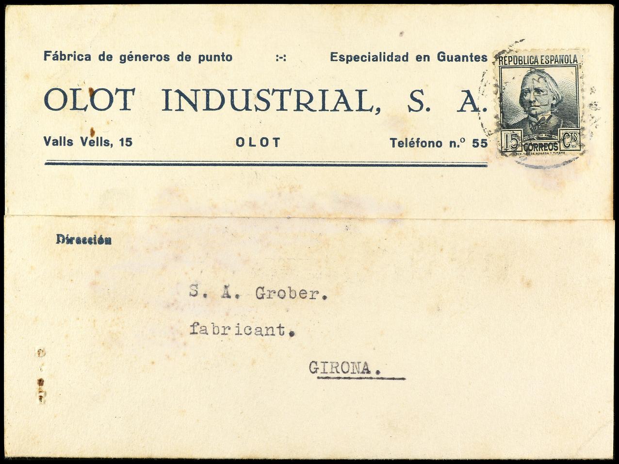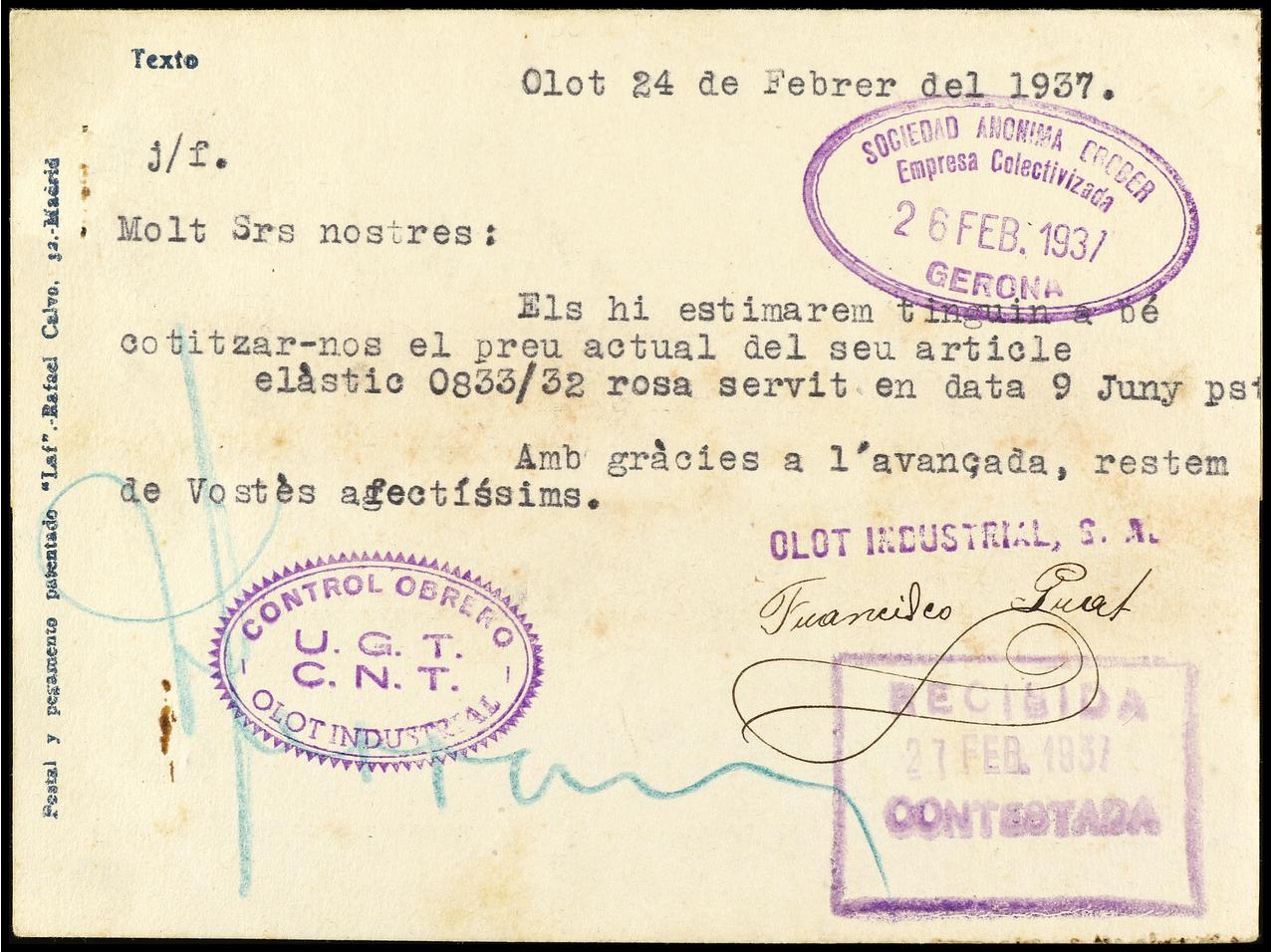 ESPAÑA GUERRA CIVIL. 1937. Tarjeta Postal de OLOT a GERONA con marcas de la UGT-CNT de intervención de la empresa y de llegada a la Empresa Colectivizada. INUSUAL. (Image1) (Image2)