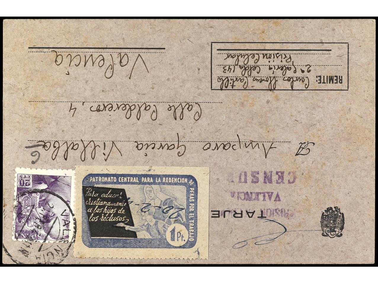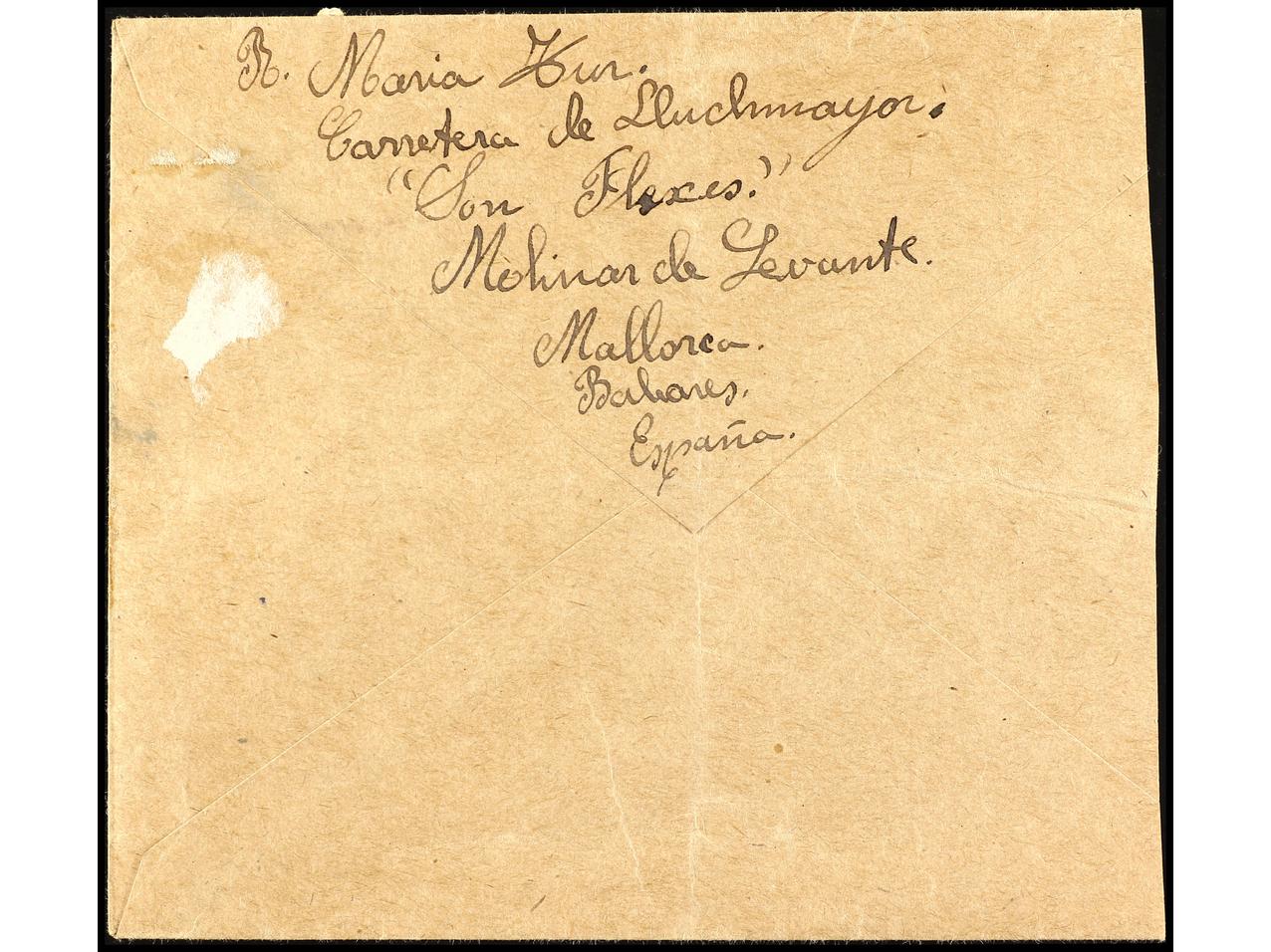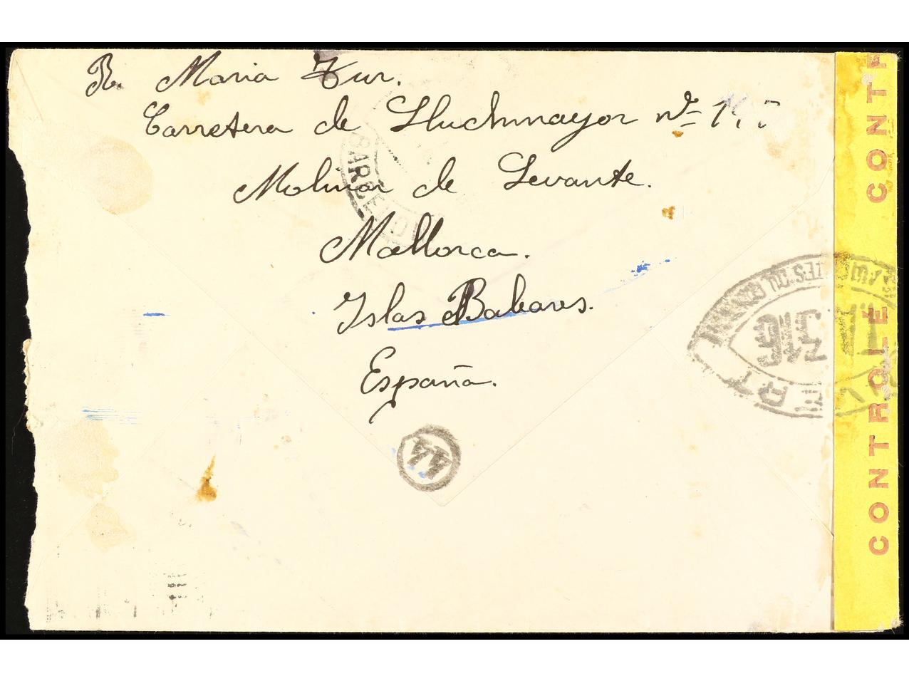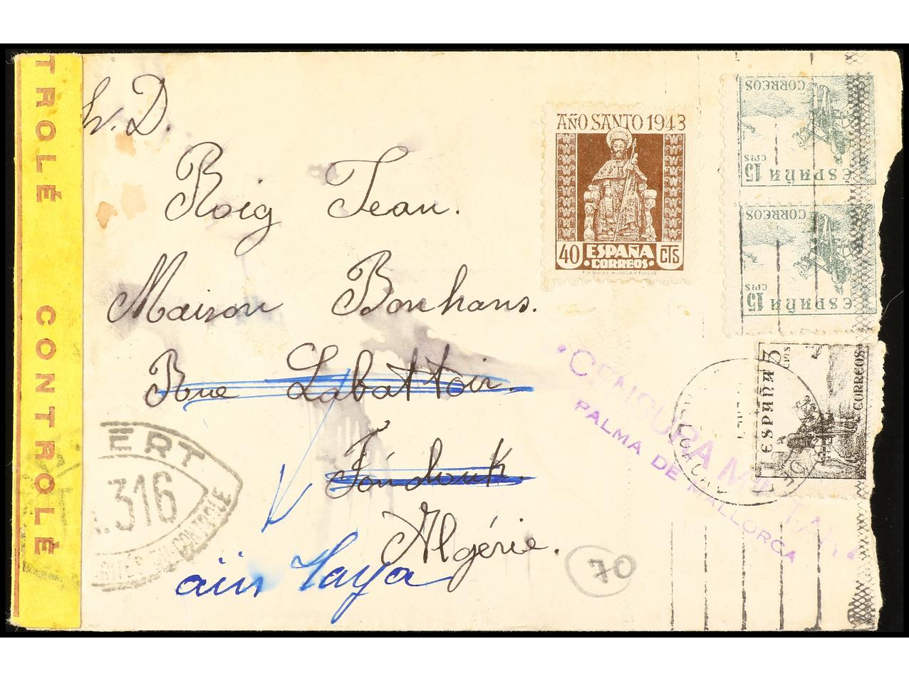 ESPAÑA GUERRA CIVIL. 1944. Sobre circulado de PALMA de MALLORCA a Juan Roig en AÏN TAYA (Argélia), uno de los pasajeros del buque inglés ´STANBROOK´ con refugiados republicanos con destino a ORÁN. Censuras en anverso y reverso. Se incluye