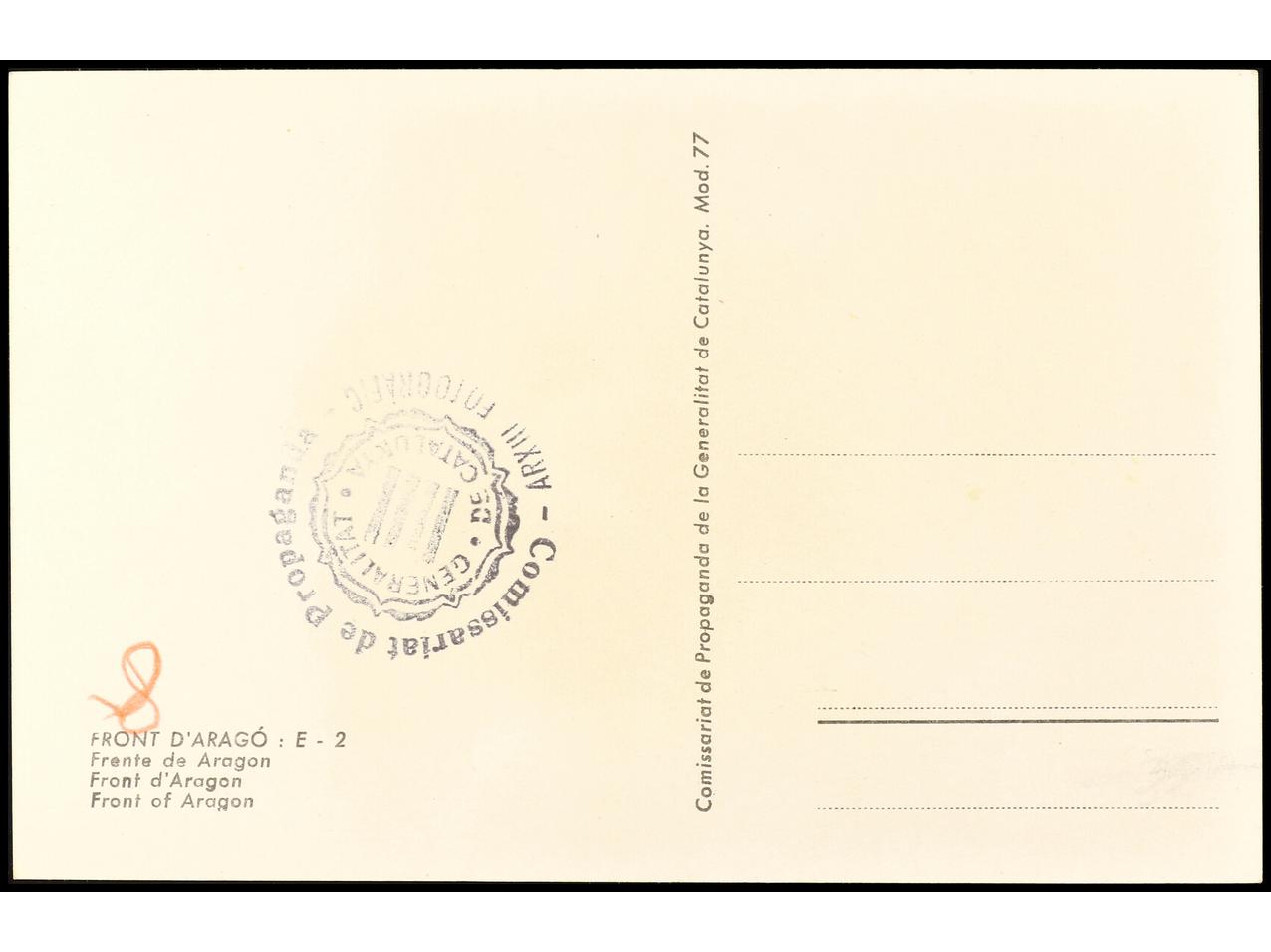 ESPAÑA GUERRA CIVIL. Tarjeta postal ilustrada ´FRONT D´ARAGÓ: E-2, editada por ´COMISSARIAT DE PROPAGANDA/ GENERALITAT DE CATALUNYA´ . RARA.