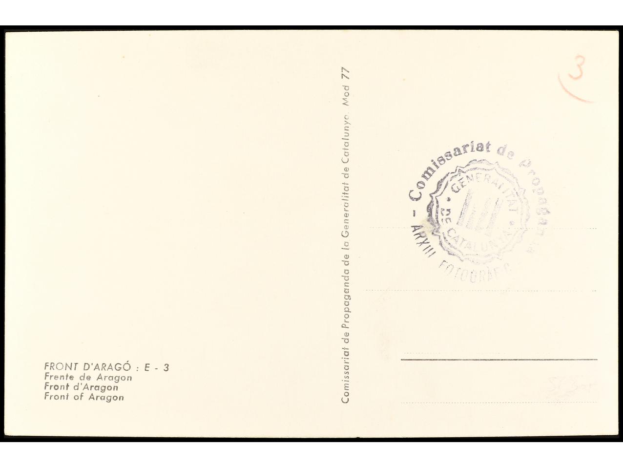 ESPAÑA GUERRA CIVIL. ZONA REPUBLICANA. Tarjeta postal ilustrada ´FRONT D´ARAGÓ: E-3´. Editada por ´COMISSARIAT DE PROPAGANDA/ GENERALITAT DE CATALUNYA´. RARA.
