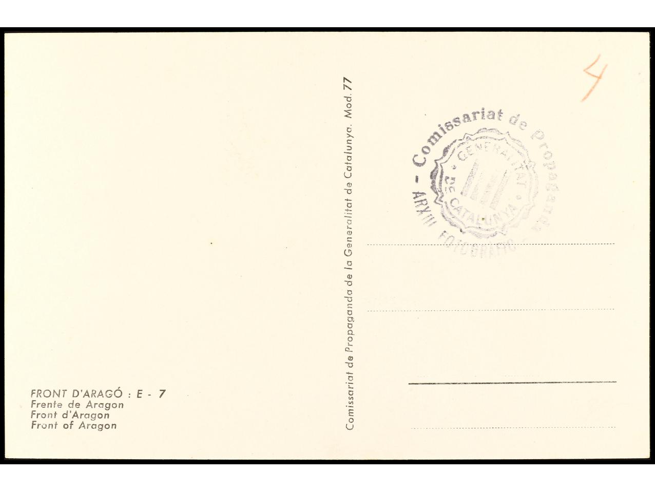 ESPAÑA GUERRA CIVIL. ZONA REPUBLICANA. Tarjeta postal ilustrada ´FRONT D´ARAGÓ: E-7´ Editada por ´COMISSARIAT DE PROPAGANDA/ GENERALITAT DE CATALUNYA´. RARA.