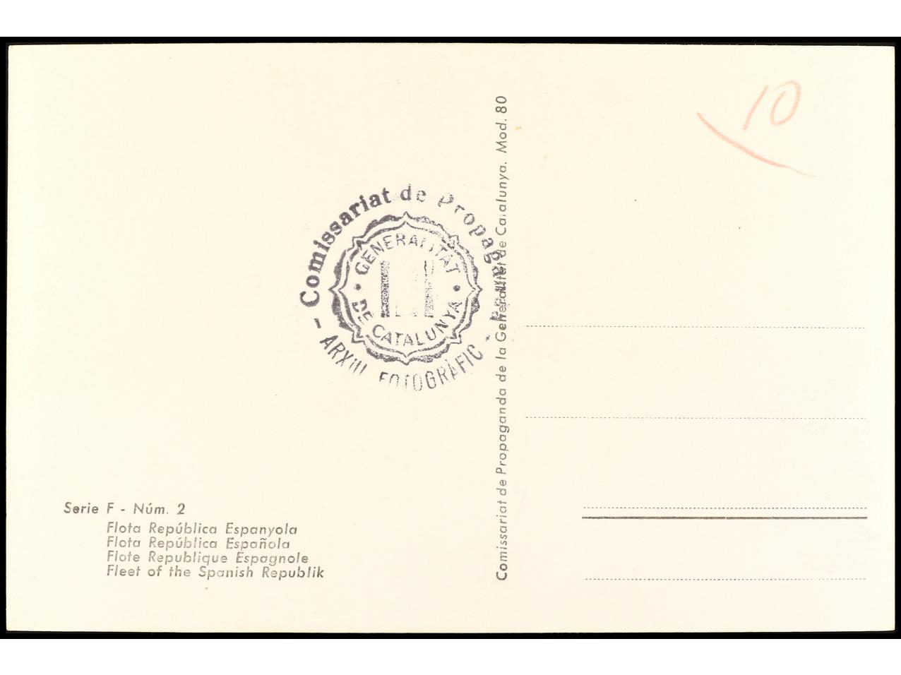 ESPAÑA GUERRA CIVIL. Tarjeta postal ilustrada ´FLOTA REPUBLICANA ESPAÑOLA/ Serie F- Num 2´ Editada por ´COMISSARIAT DE PROPAGANDA/ GENERALITAT DE CATALUNYA´. RARA. (Image1) (Image2)