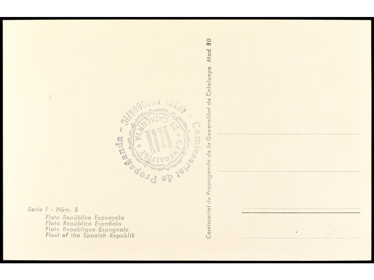ESPAÑA GUERRA CIVIL. ZONA REPUBLICANA. Tarjeta postal ilustrada ´FLOTA REPUBLICANA ESPAÑOLA/ Serie F-Núm 5´. Editada por ´COMISSARIAT DE PROPAGANDA/ GENERALITAT DE CATALUNYA´. RARA. (Image1) (Image2)