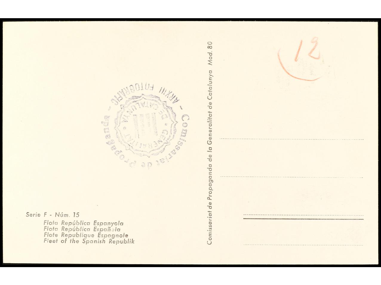 ESPAÑA GUERRA CIVIL. ZONA REPUBLICANA. ´FLOTA REPUBLICANA ESPAÑOLA/ Serie F-Num. 15´. Editada por ´COMISSARIAT DE PROPAGANDA/ GENERALITAT DE CATALUNYA´. RARA.