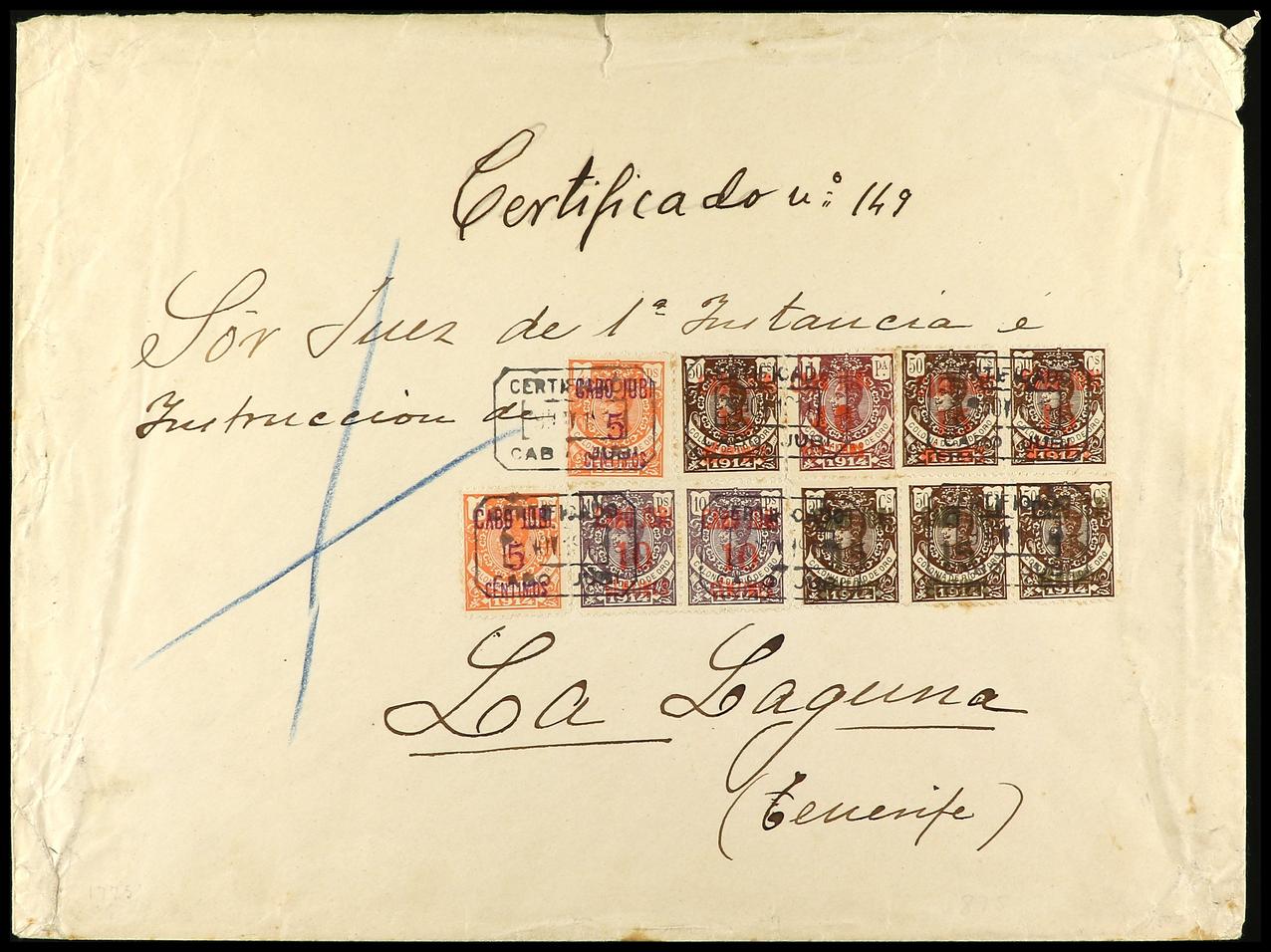 COLONIAS ESPAÑOLAS: CABO JUBY. 1917. CABO JUBY a LA LAGUNA. Espectacular franqueo. Rarísima circulación comercial de estos sellos, al dorso llegada. Ex. col. J.M. ALFARO. (Image1) (Image2)