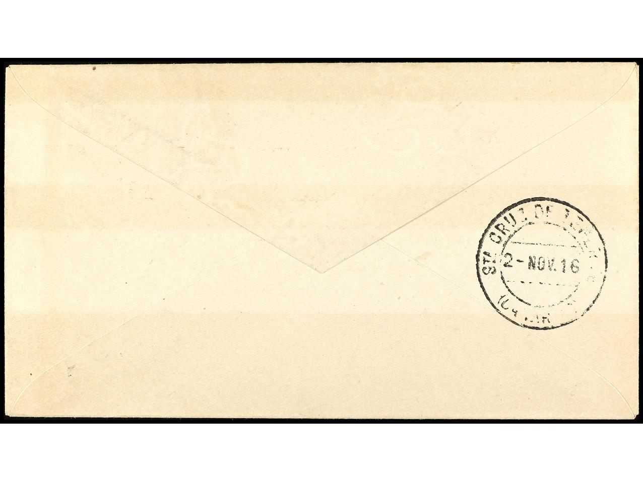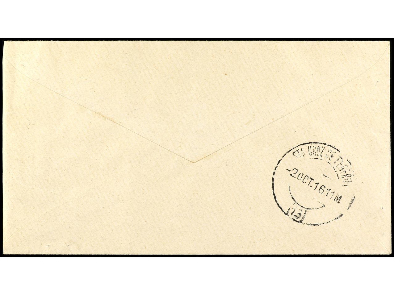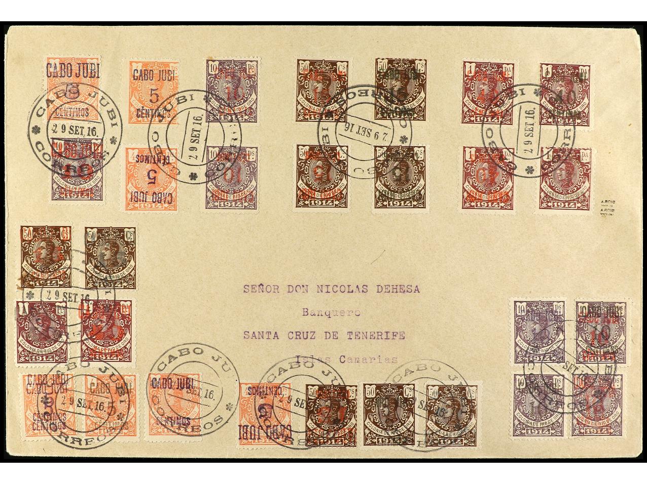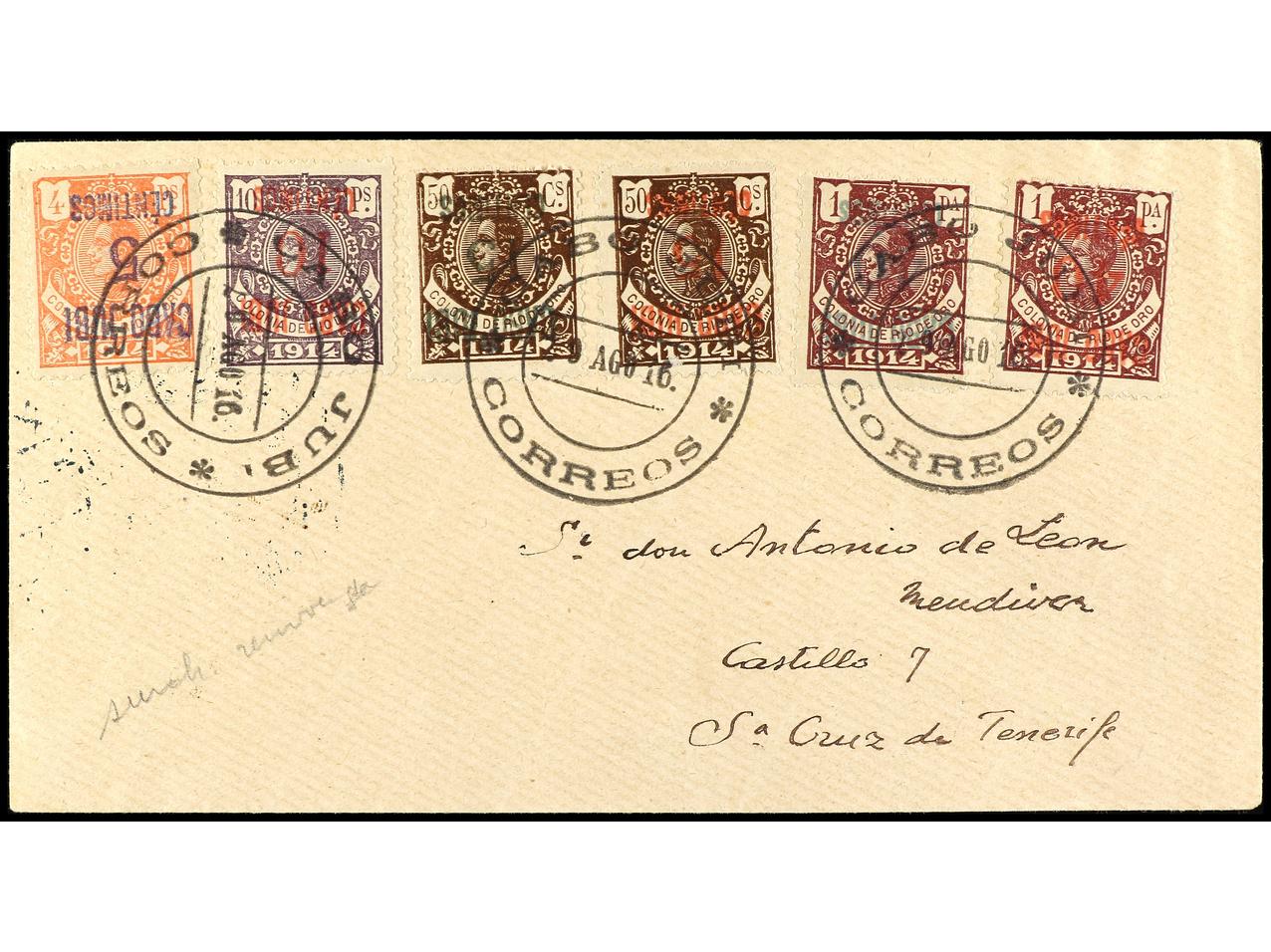 COLONIAS ESPAÑOLAS: CABO JUBY. 1916. CABO JUBY a SANTA CRUZ DE TENERIFE. 5 cts. s. 4 pts. habilitación doble y 10 pts. habilitación doble en carmín y verde, al dorso llegada. Ed.1hh, 2hha. (Image1) (Image2)