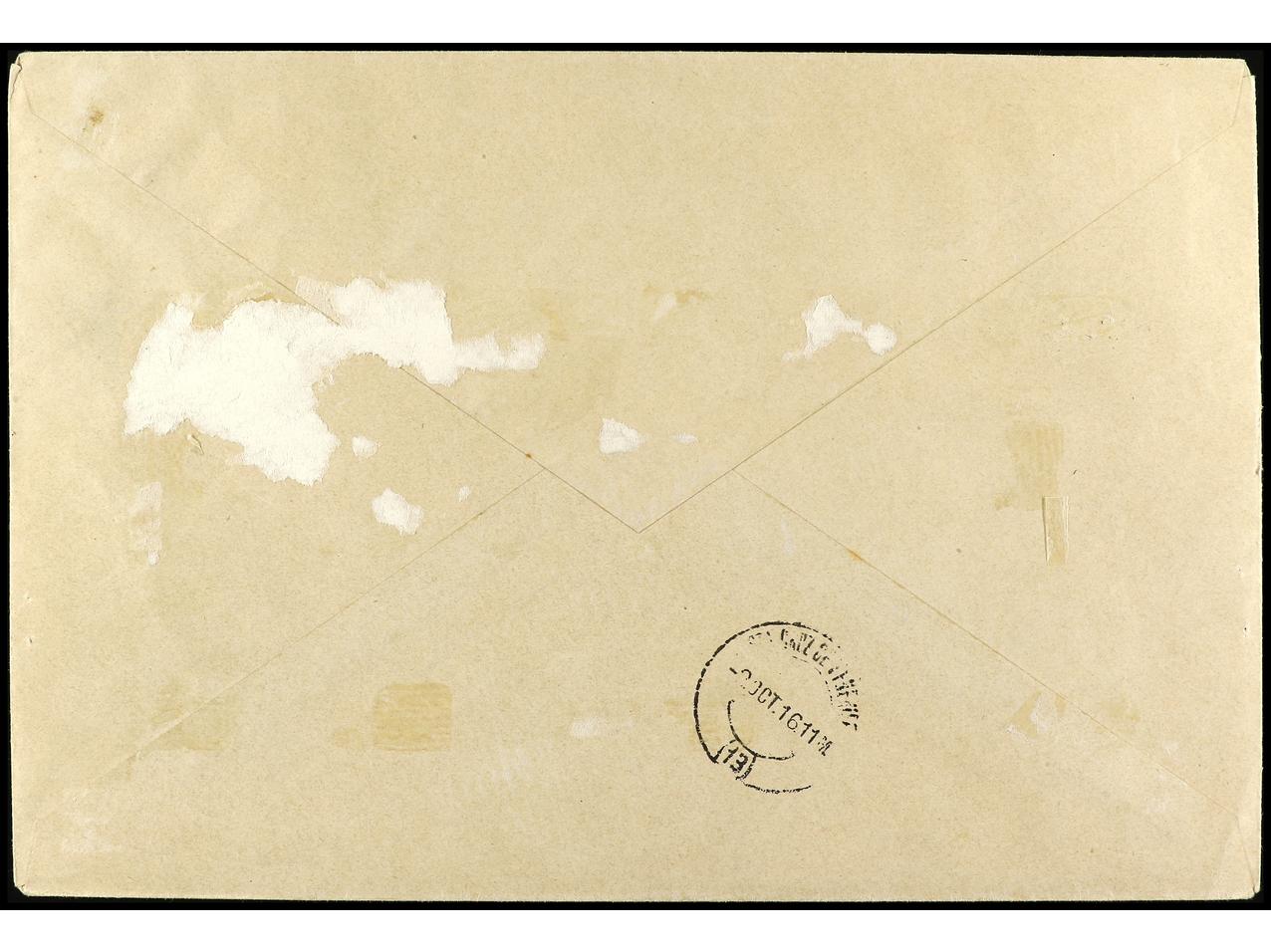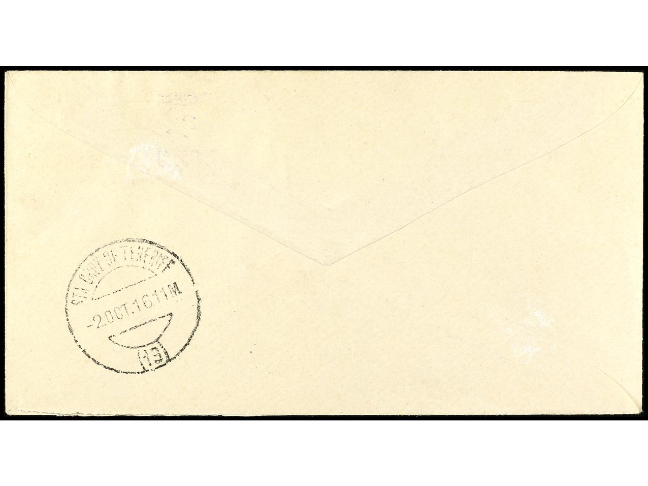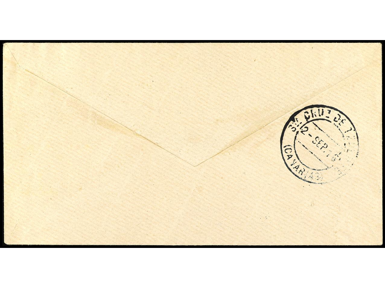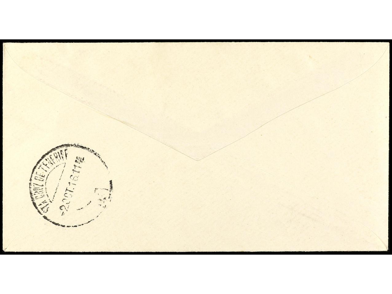 COLONIAS ESPAÑOLAS: CABO JUBY. 1916. CABO JUBY a SANTA CRUZ DE TENERIFE. 5 cts. s. 4 pts. habilitación doble y 10 pts. habilitación doble en carmín y verde, al dorso llegada. Ed.1hh, 2hha. (Image1) (Image2)