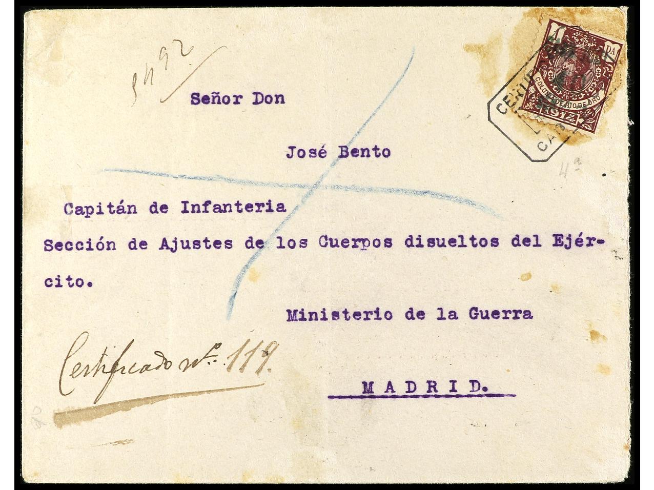 COLONIAS ESPAÑOLAS: CABO JUBY. 1916. CABO JUBY a MADRID. 40 cts. s. 1 pta. violeta carta certificada. Muy rara circulación comercial, al dorso llegada. Ed.4A.