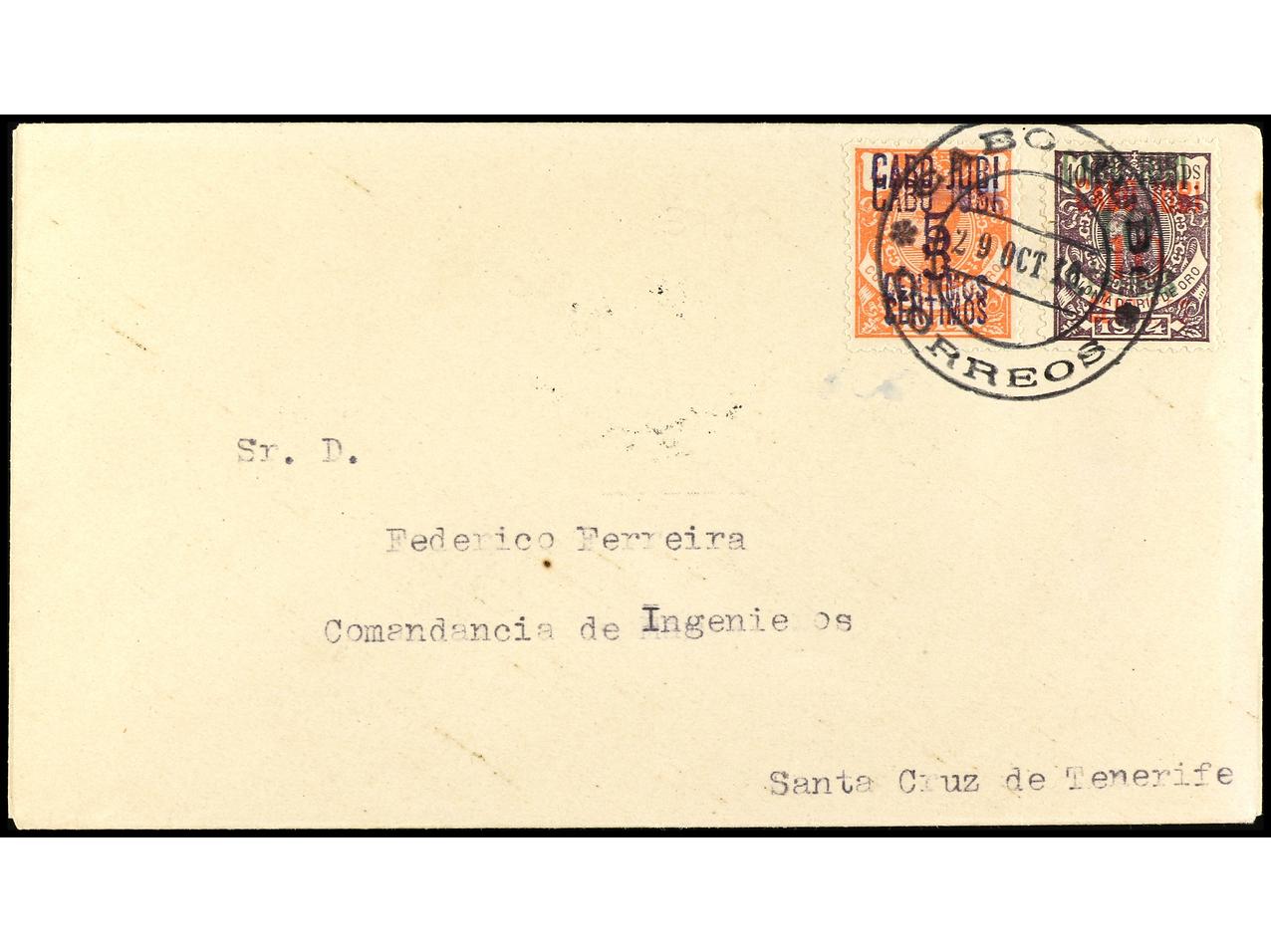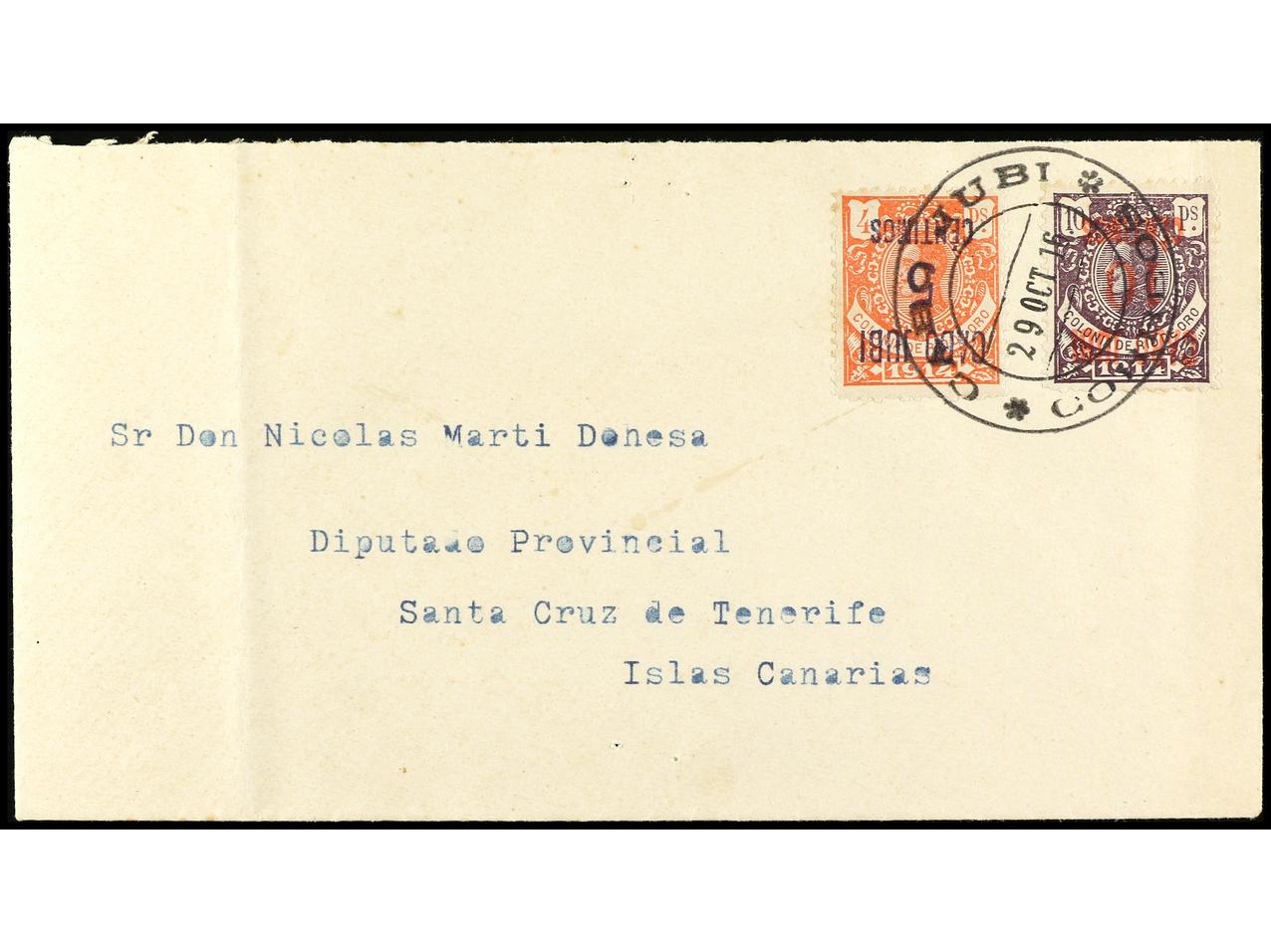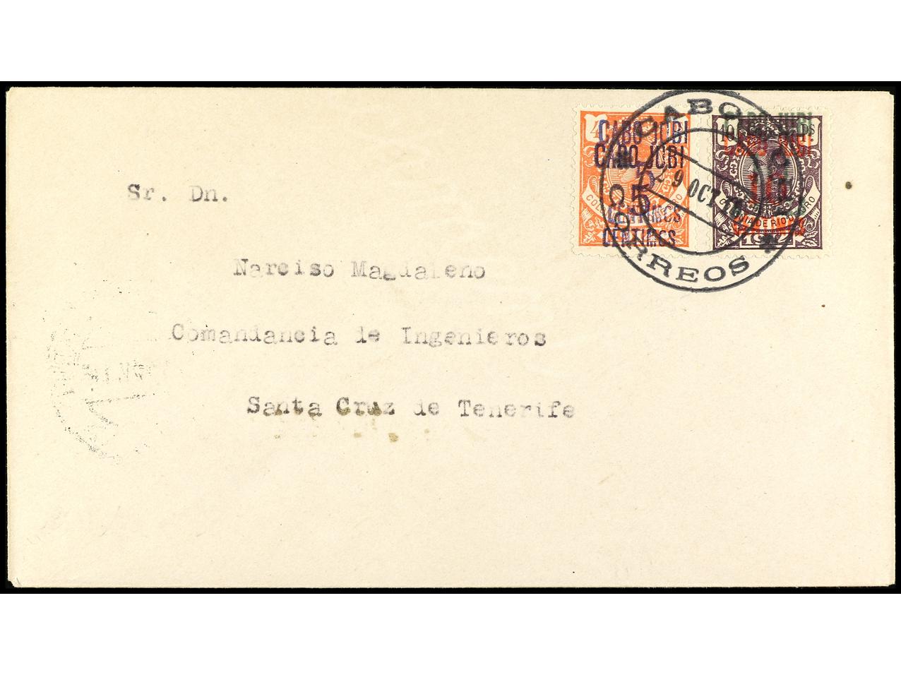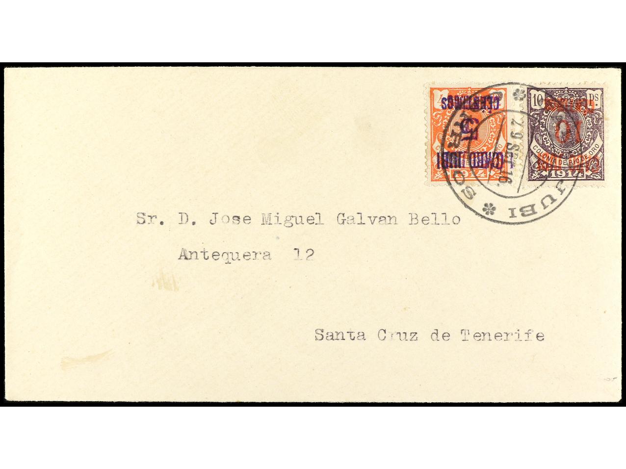 COLONIAS ESPAÑOLAS: CABO JUBY. 1916. CABO JUBY a SANTA CRUZ DE TENERIFE. 5 cts. s. 4 pts. habilitación invertida doble y 10 cts. s. 10 pts. habilitación invertida, al dorso llegada. RARÍSIMA. Dictamen GRAUS. Ed.1hhi, 2hi. (Image1) (Image2)