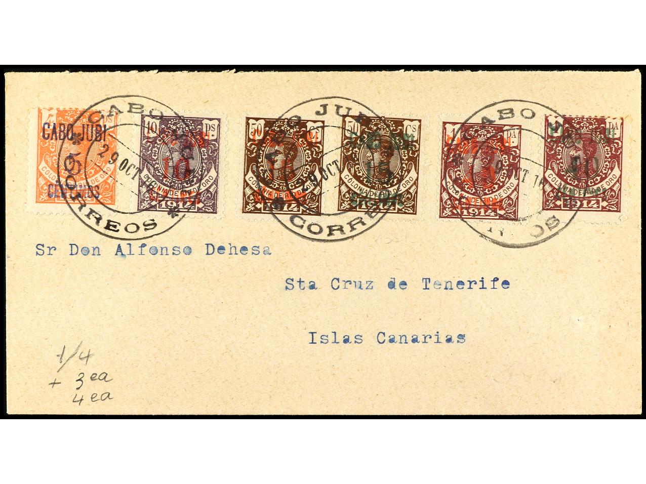 COLONIAS ESPAÑOLAS: CABO JUBY. 1916. CABO JUBY a SANTA CRUZ DE TENERIFE. Serie completa habilitación invertida, al dorso llegada. Ed.1/4hh + 3A/4Ahh.