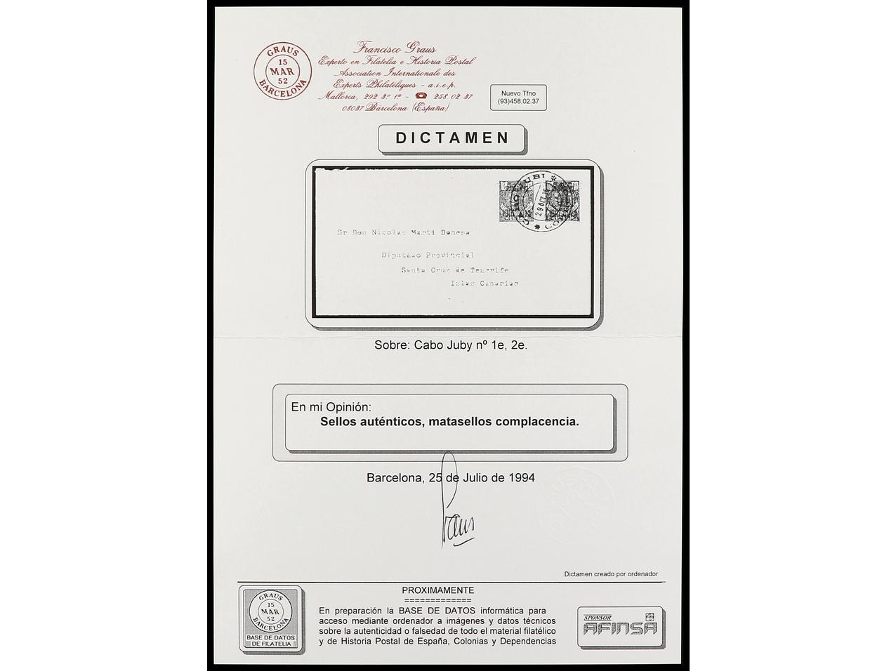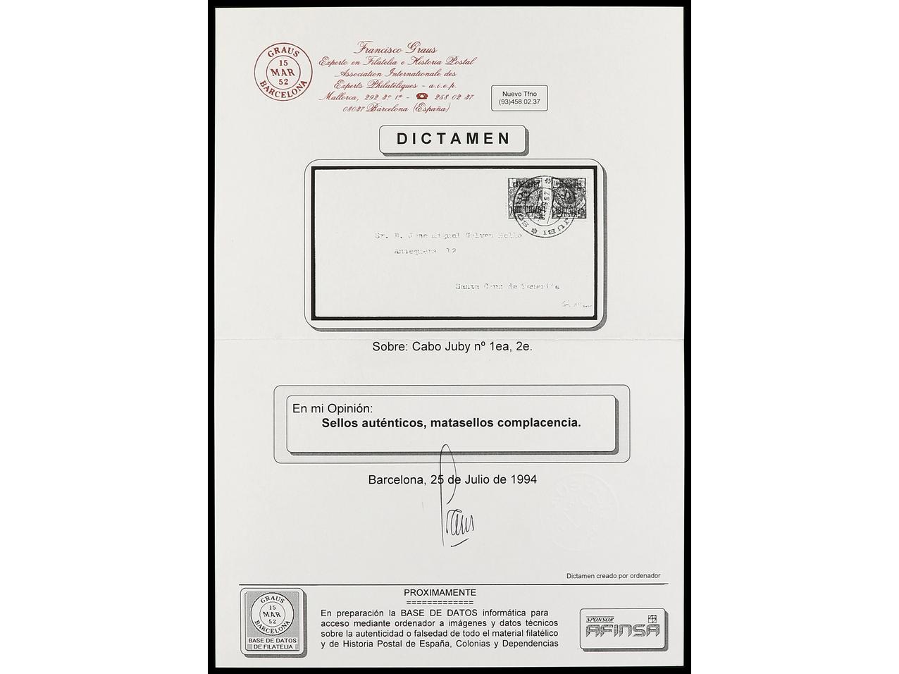 COLONIAS ESPAÑOLAS: CABO JUBY. 1916. CABO JUBY a SANTA CRUZ DE TENERIFE. 5 cts. s. 4 pts. y 10 cts. s. 10 pts. habilitaciones invertidas, al dorso llegada. Dictamen GRAUS. Ed.1hi, 2hi. (Image1) (Image2)