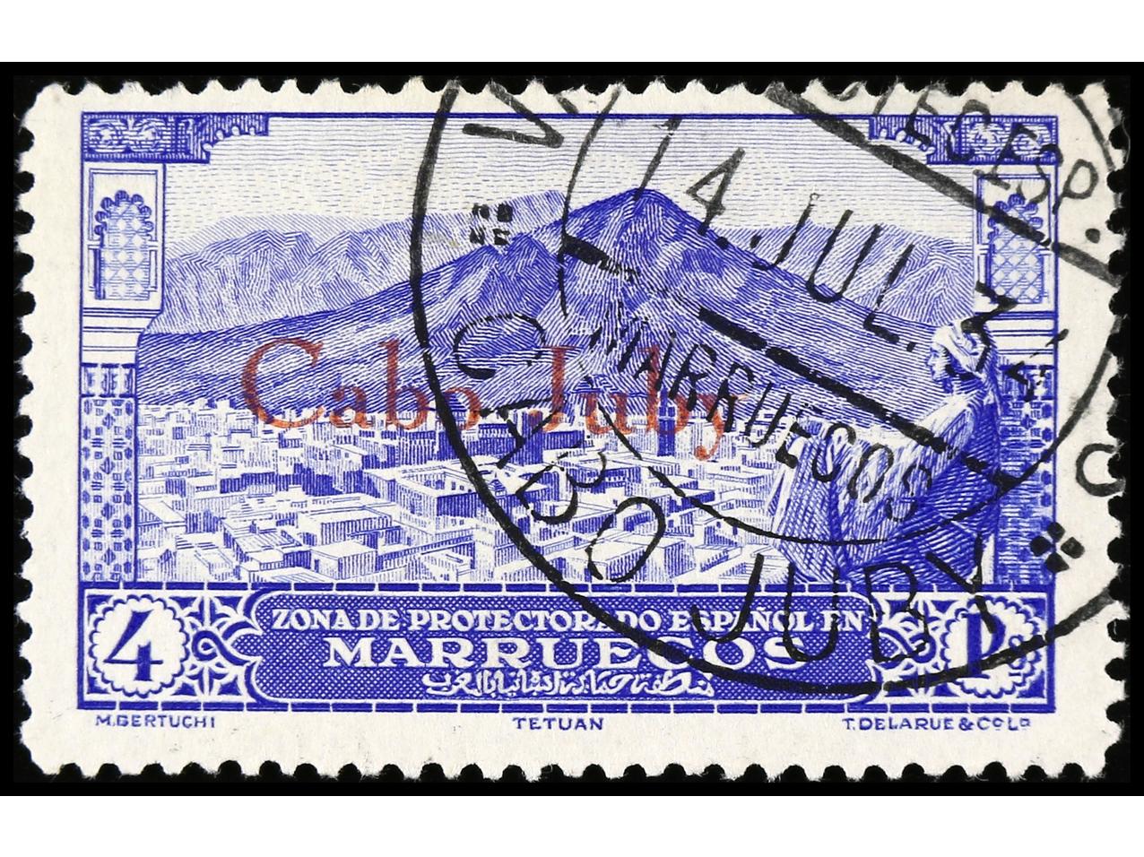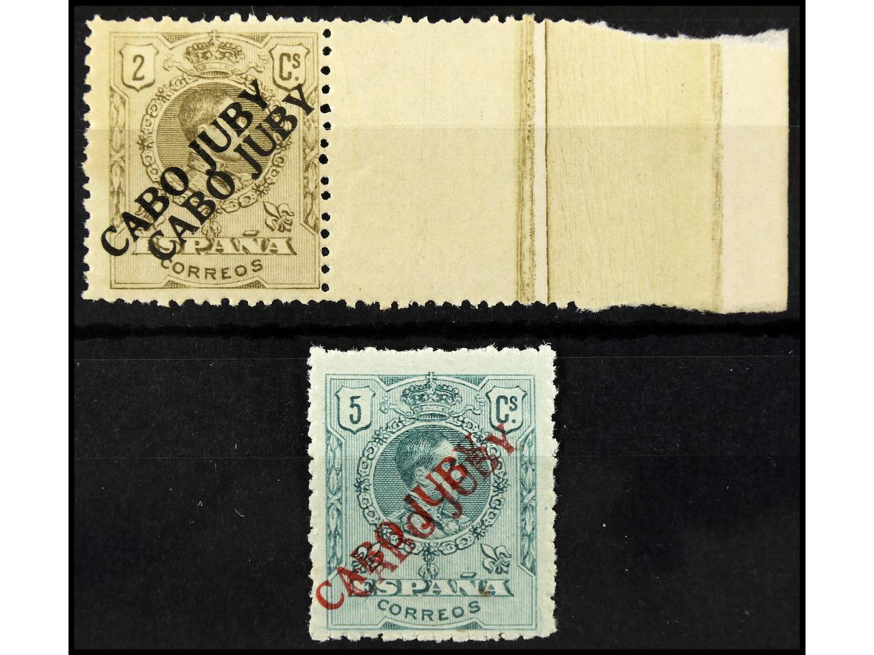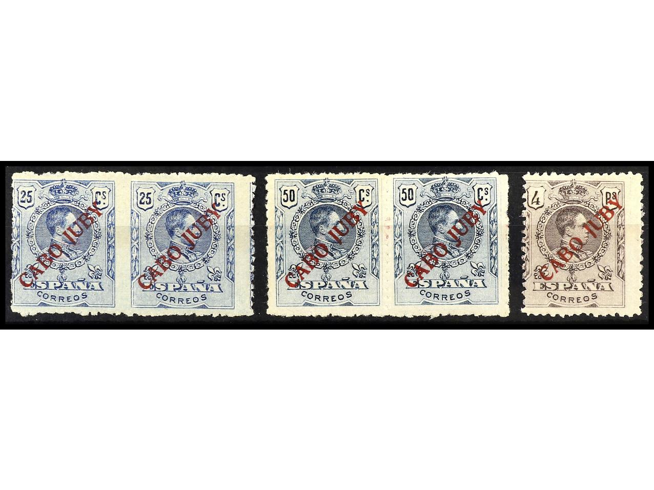 COLONIAS ESPAÑOLAS: CABO JUBY. 25 c. y 50 c., pareja, uno ´J´ corta y 4 ptas. ´J´ corta. Ed.11, 14 y 16 var. Cat. +/- 900€. (Image1) (Image2)