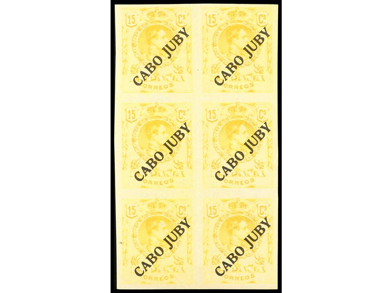 COLONIAS ESPAÑOLAS: CABO JUBY. 15 c. amarillo, bloque de 6 SIN DENTAR. Pliegue central sin afectar a los sellos. Ed.9s. Cat. 342€. (Image1)