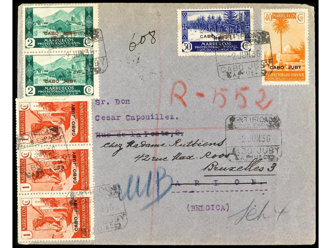 COLONIAS ESPAÑOLAS: CABO JUBY. 1936. CABO JUBY a BÉLGICA. 1 cto. (3), 2 cts. (2), 40 cts. y 50 cts. al dorso llegada. MUY BONITA. Ed.67 (3), 68 (2), 81, 82.