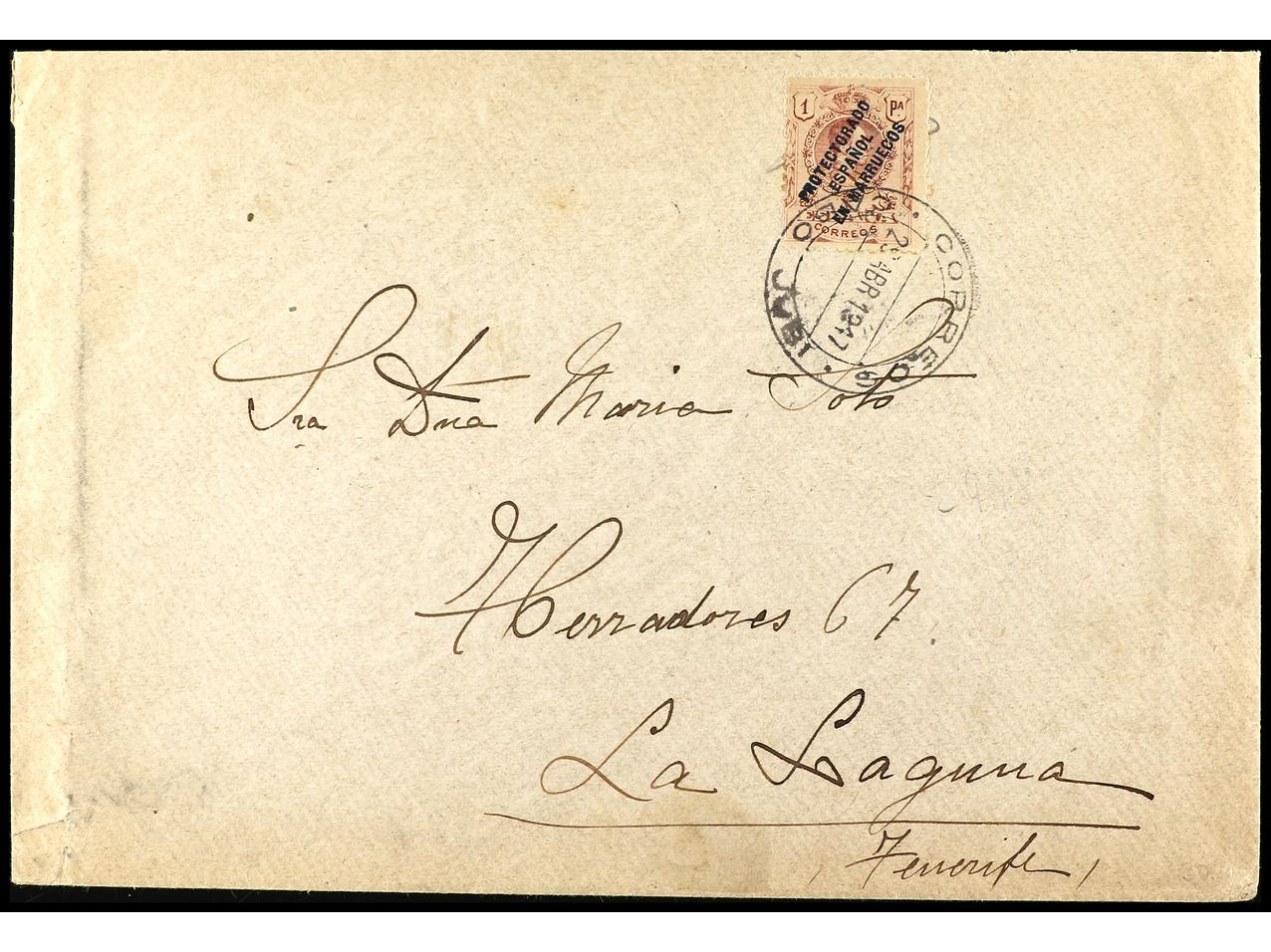 COLONIAS ESPAÑOLAS: CABO JUBY. 1917. CABO JUBY a LA LAGUNA. 1 pta. carmín de Marruecos usado en Cabo Juby, al dorso llegada. MUY RARA. Ed.4L.