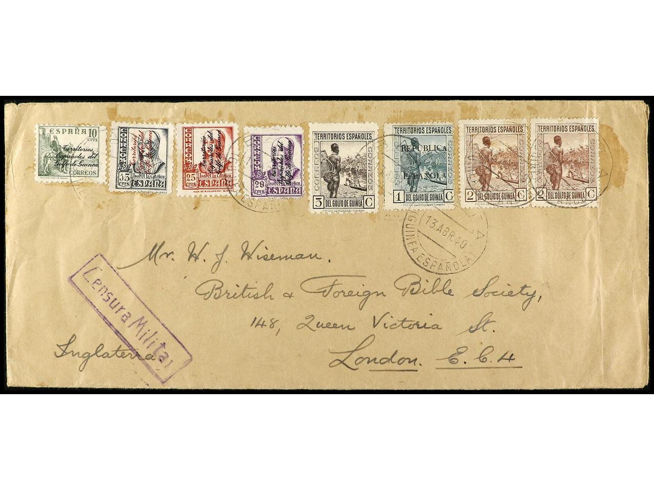 COLONIAS ESPAÑOLAS: GUINEA. 1940. BATA a LONDRES. Precioso franqueo, al dorso tránsito de Sta. Isabel. Ed.216, 203 (2), 204, 256/59. (Image1) (Image2)