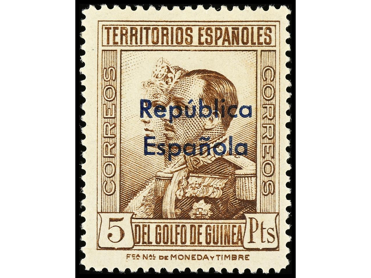 COLONIAS ESPAÑOLAS: GUINEA. SERIE COMPLETA en parejas habilitados MUESTRA, un sello variedad ´Españolo´ (uno por hoja). RARÍSIMA VARIEDAD COMBINADA, probablemente ÚNICA CONOCIDA. Ed.230/43M. (Image1) (Image2)