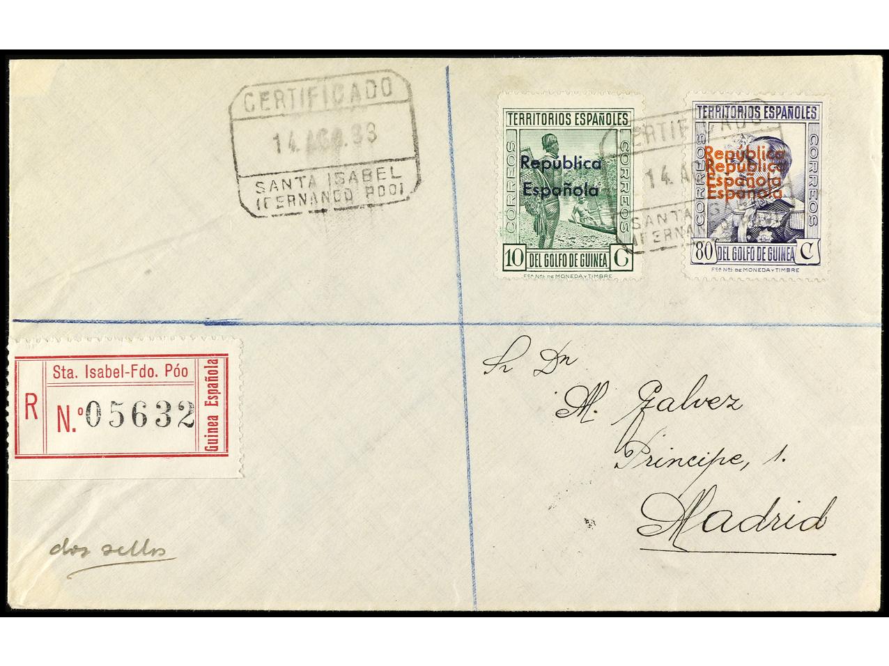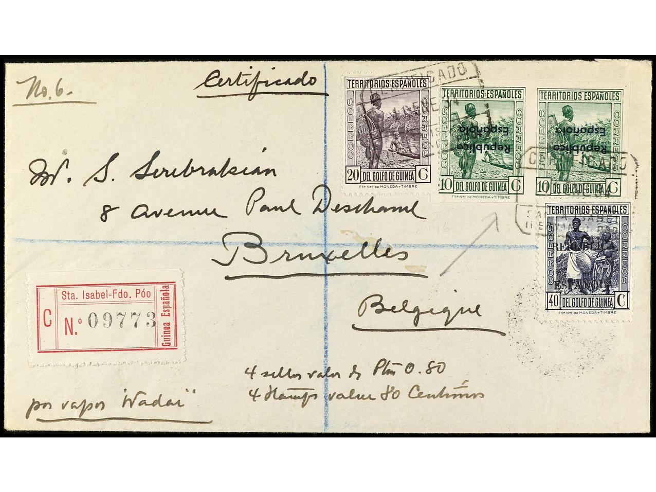 COLONIAS ESPAÑOLAS: GUINEA. 1933. Certificado de SANTA ISABEL a MADRID. Precioso franqueo en carta circulada. Al dorso llegada. Ed.231, 233, 235, 237, 239/40.
