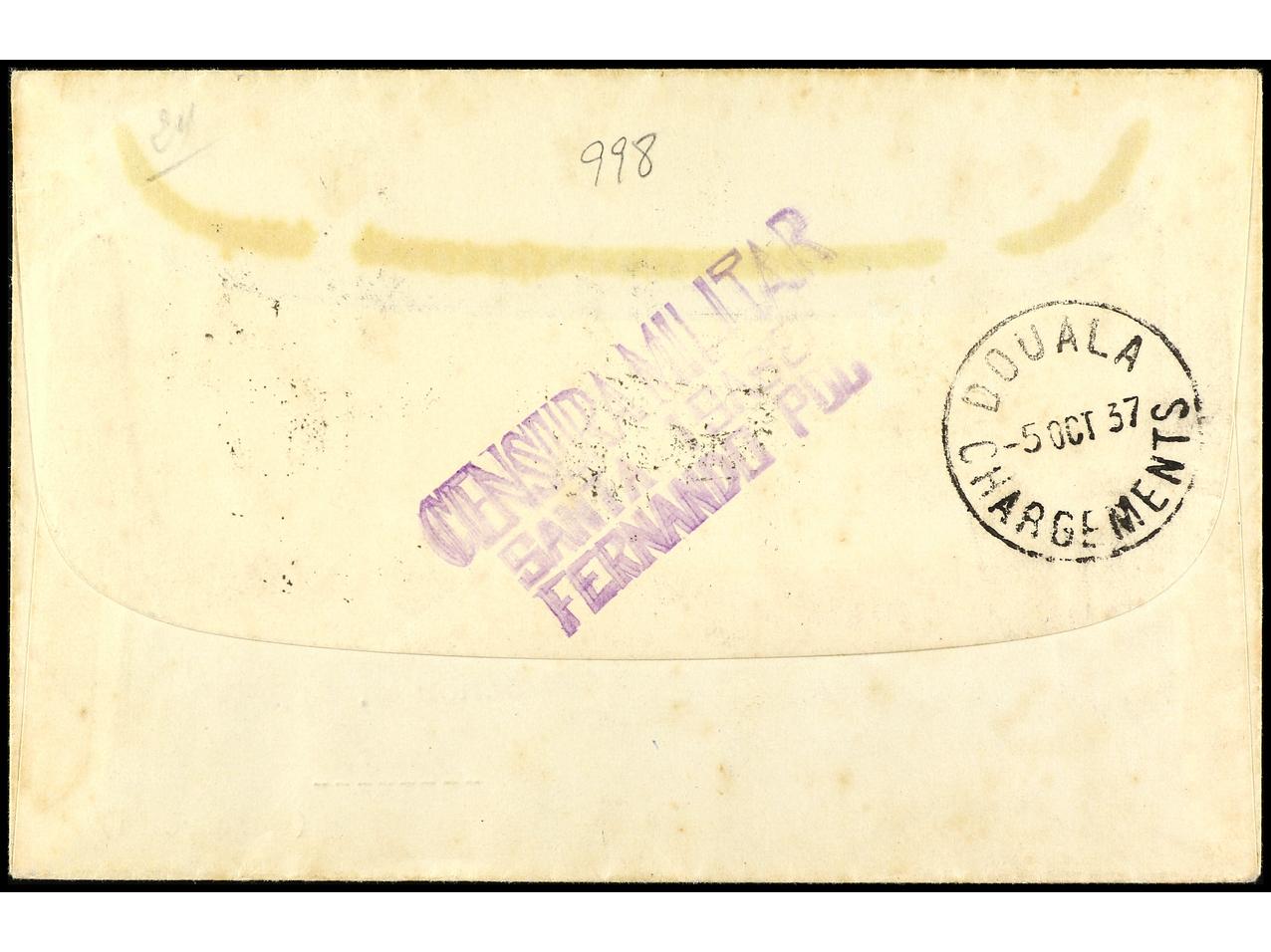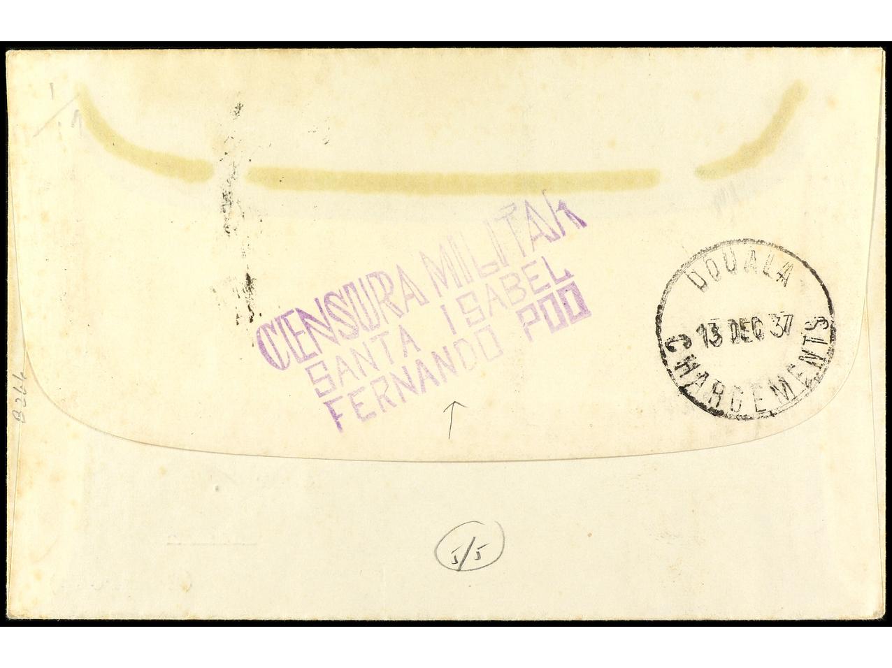 COLONIAS ESPAÑOLAS: GUINEA. 1937. STA. ISABEL a DOUALA (Camerún). 30 cts. sobre 40 cts. azul (4) y sello local de 10 cts. sobre 5 cts. habilitado FRANCO SUSCRIPCION NACIONAL, al dorso llegada. RARA. Ed.253 (4). (Image1) (Image2)