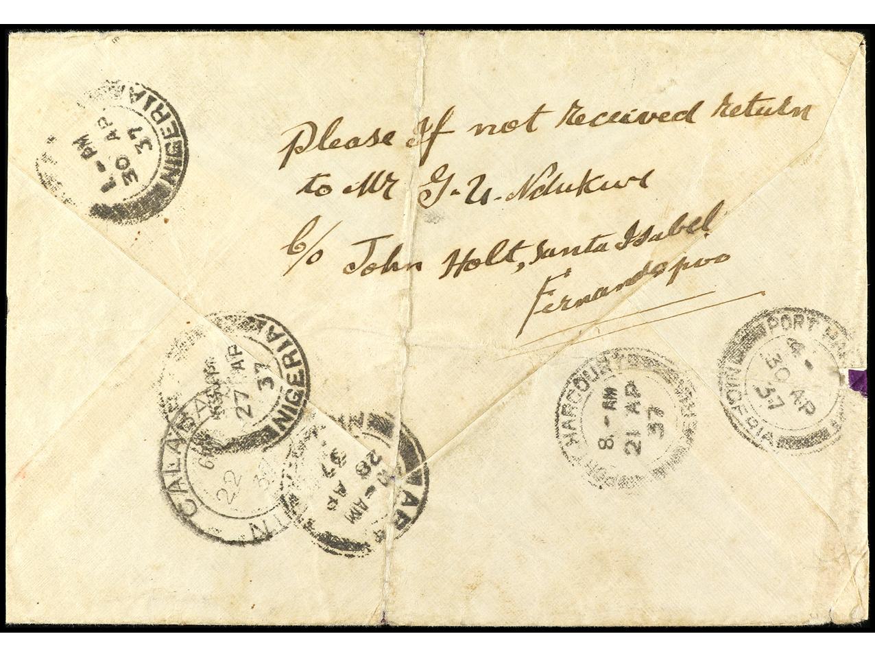 COLONIAS ESPAÑOLAS: GUINEA. 1937. STA. ISABEL a NIGERIA. Circulada con sellos locales con habilitación FRANCO SUBSCRIPCION NACIONAL de 10 cts. sobre 5 cts. castaño, carta devuelta. (Image1) (Image2)