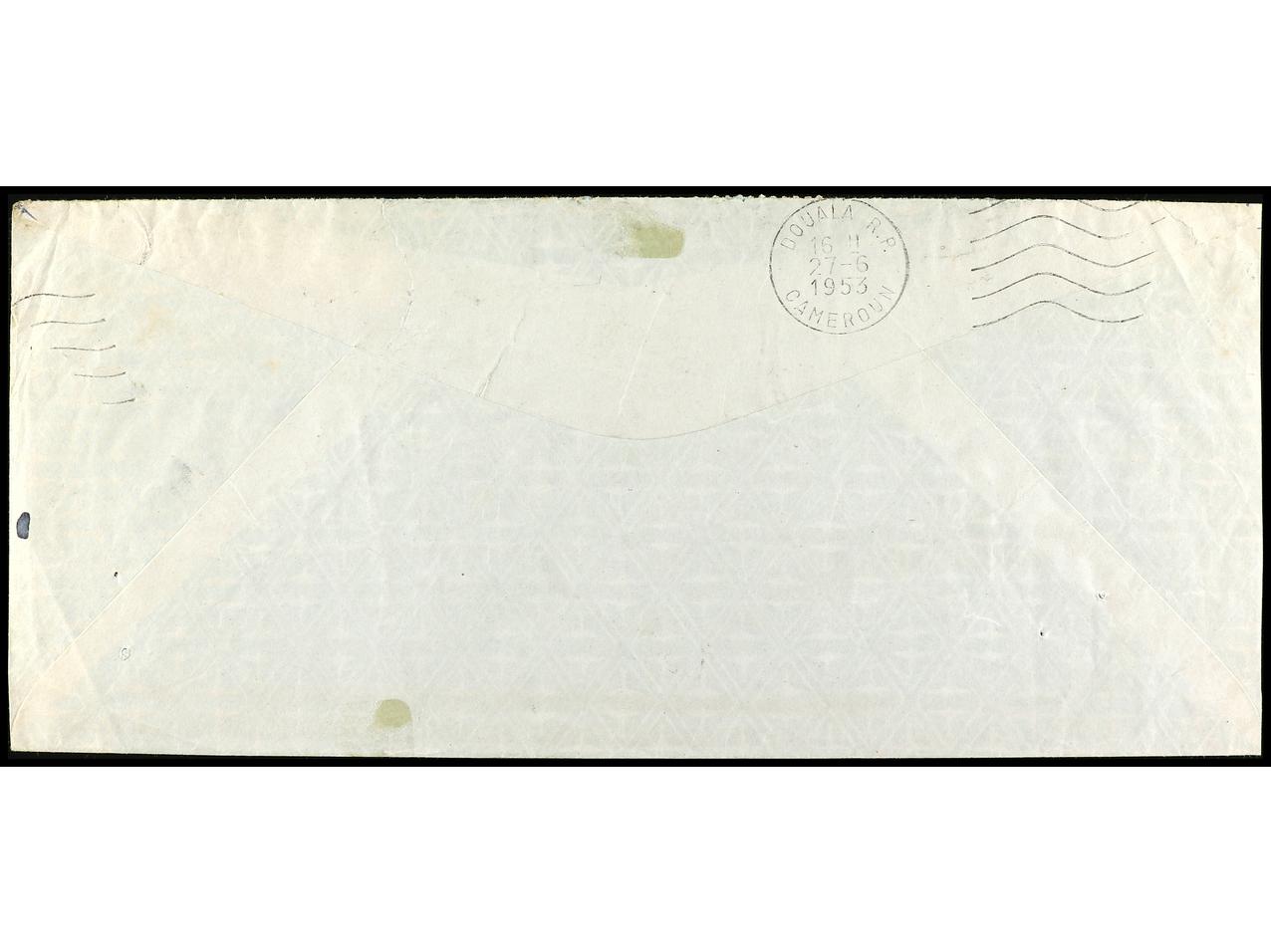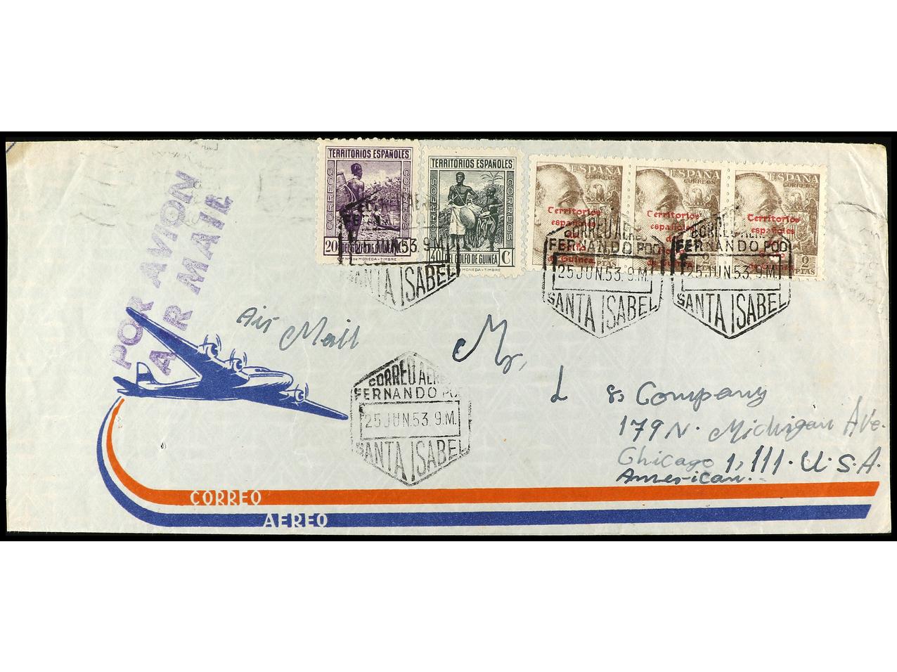 COLONIAS ESPAÑOLAS: GUINEA. 1953. SANTA ISABEL a U.S.A. Precioso franqueo, al dorso tránsito por Douala (Camerún). (Image1) (Image2)