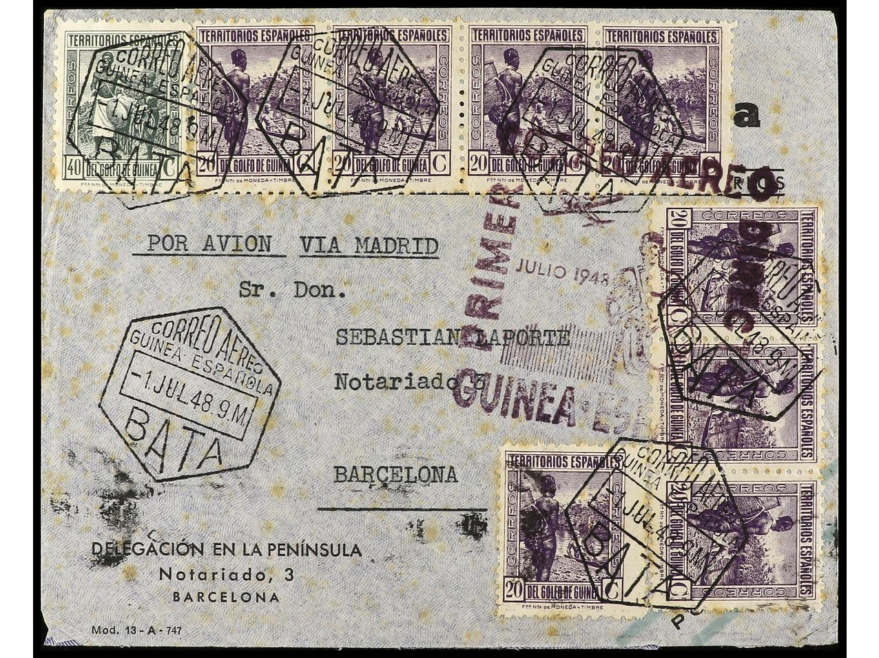 COLONIAS ESPAÑOLAS: GUINEA. 1941. BATA a BARCELONA. 20 cts. lila (8), 4 cts. marca especial del PRIMER CORREO AÉREO GUINEA-ESPAÑA, al dorso llegada. RARA y más en carta comercial. Ed.265 (8), 266. (Image1) (Image2)