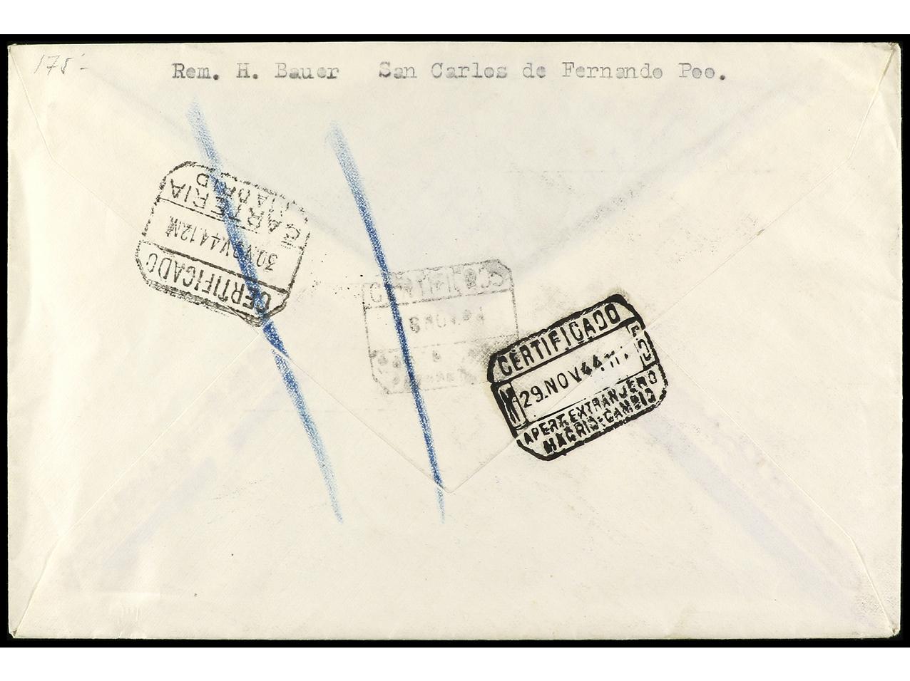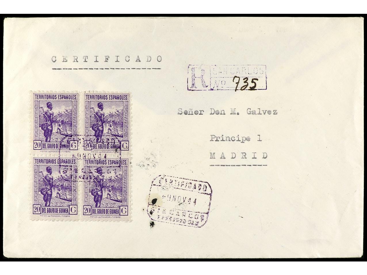 COLONIAS ESPAÑOLAS: GUINEA. 1944. S. CARLOS a MADRID. 20 cts. lila (4) carta certificada, al dorso llegada. Ed.265 (4). (Image1) (Image2)