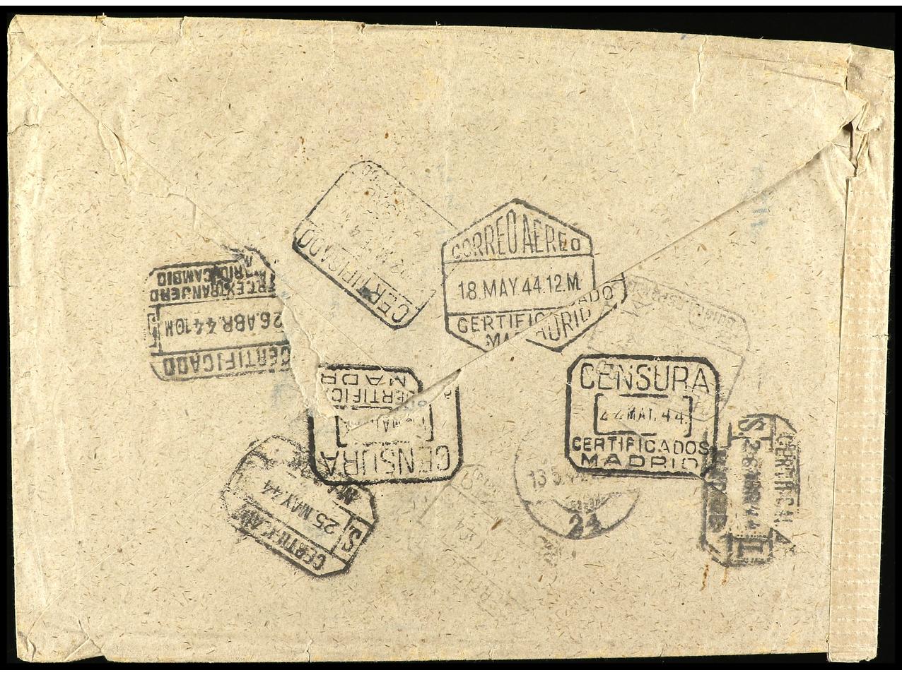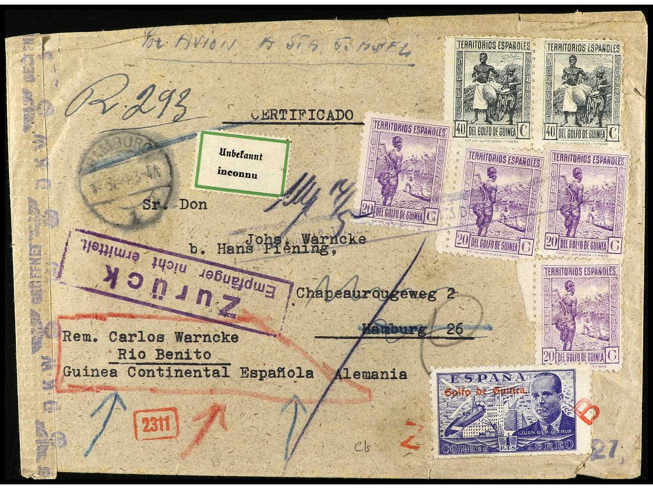 COLONIAS ESPAÑOLAS: GUINEA. 1943. RIO BENITO a ALEMANIA. Carta certificada devuelta al remitente por destinatario desconocido, diversas tarifas en anverso y reverso. Ed.265 (4), 266 (2), 268. (Image1) (Image2)