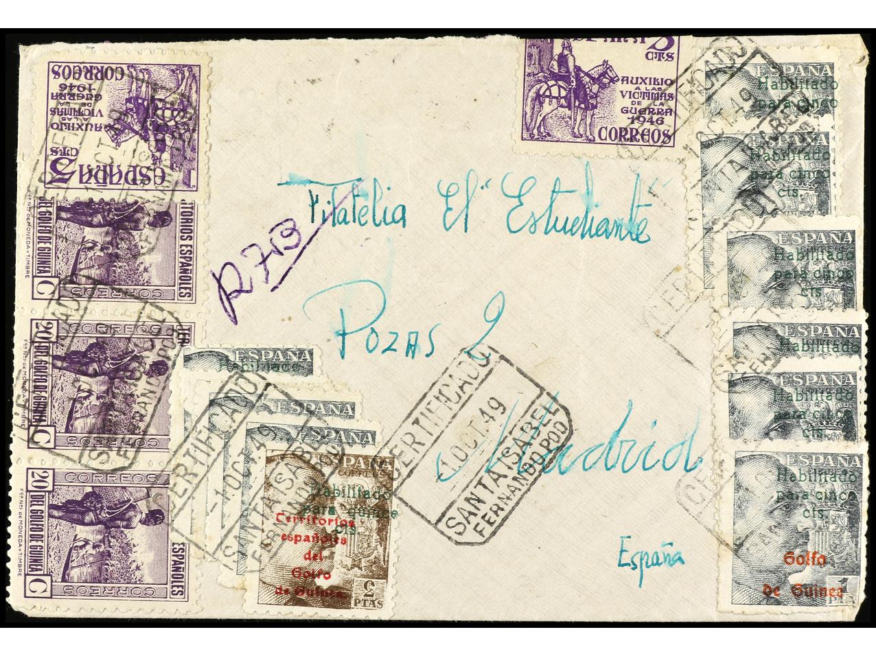 COLONIAS ESPAÑOLAS: GUINEA. 1949. STA. ISABEL a MADRID. Inusual franqueo con dos sellos de España de 5 cts. de Auxilio a las víctimas de la guerra, al dorso llegada. Ed.265 (3), 273 (10), 274. (Image1) (Image2)