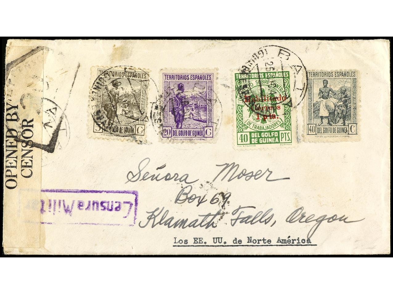 COLONIAS ESPAÑOLAS: GUINEA. 1941. BATA a U.S.A. 5 cts., 20 cts. y 40 cts. y sello Provisional de 1 pta. sobre 40 cts. verde, Censura y llegada al dorso. RARO franqueo. Ed.259k, 264/66. (Image1) (Image2)