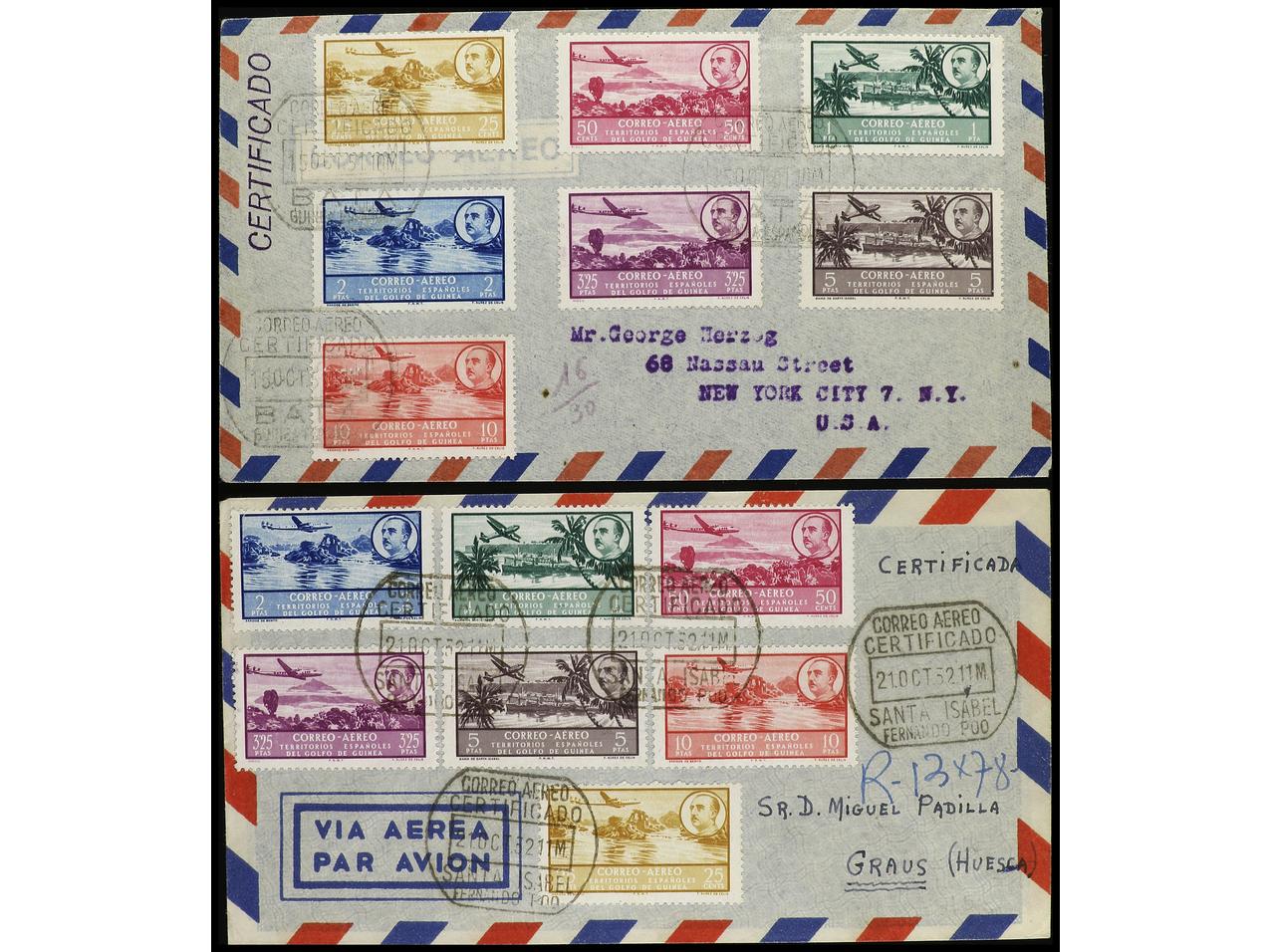COLONIAS ESPAÑOLAS: GUINEA. 1951. 2 cartas circuladas con la SERIE COMPLETA desde BATA a STA. ISABEL. Al dorso llegadas. Ed.298/304. (Image1) (Image2)