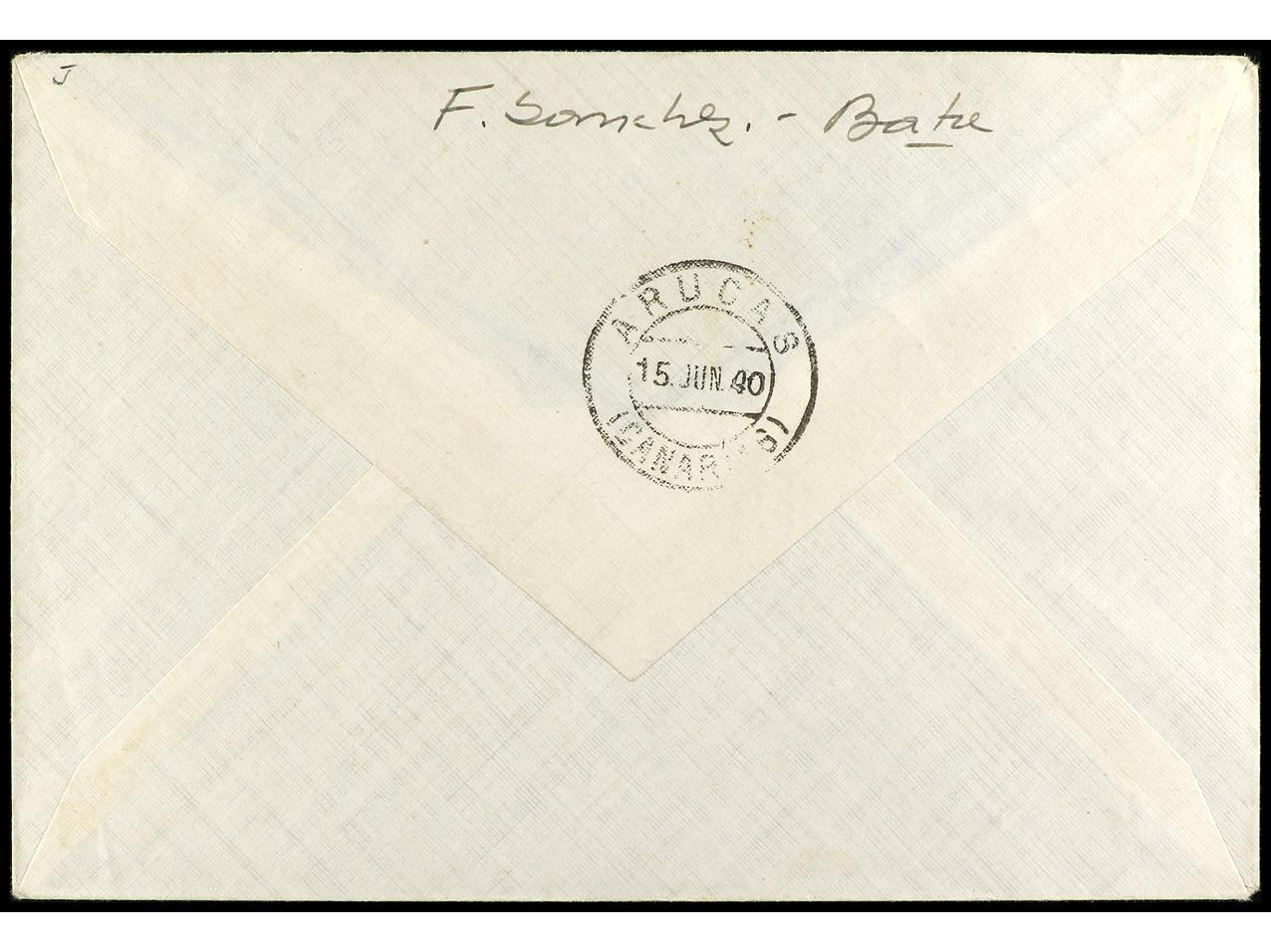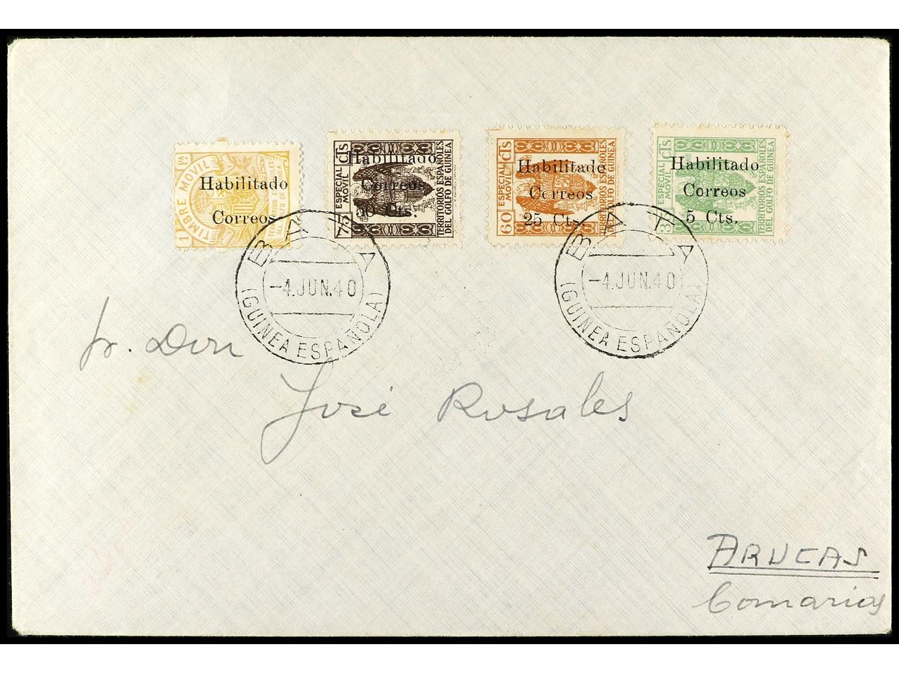 COLONIAS ESPAÑOLAS: GUINEA. 1940. BATA a ARAUCAS (Islas Canarias). Precioso franqueo con sellos PROVISIONALES destacando el raro 1 pta. amarillo, al dorso llegada. Ed.259I, 259B, 259E, 259G. (Image1) (Image2)