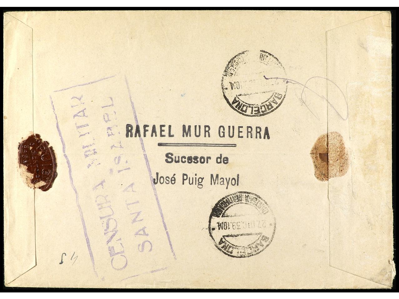 COLONIAS ESPAÑOLAS: GUINEA. 1939. STA. ISABEL a BARCELONA. 40 cts. sobre 80 cts. azul (2), Carta certificada. Censura Militar y llegada. Ed.255 (2).