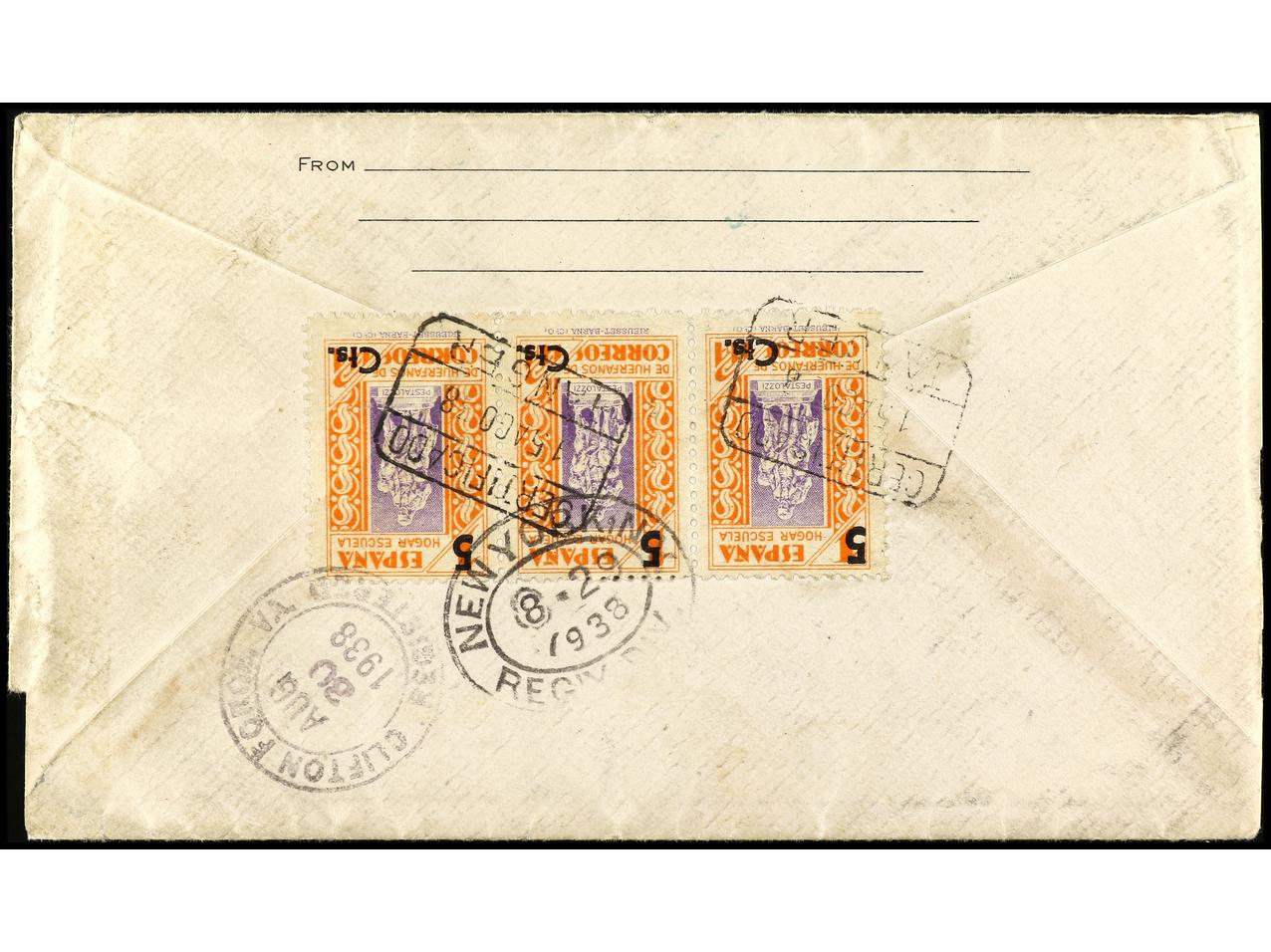 COLONIAS ESPAÑOLAS: TANGER. 1938. TÁNGER a VIRGINIA (Usa). Franqueo de Tánger y España y al dorso sellos de Beneficencia, tránsito y llegada. Circulda por correo certificado. MUY BONITA. (Image1) (Image2)
