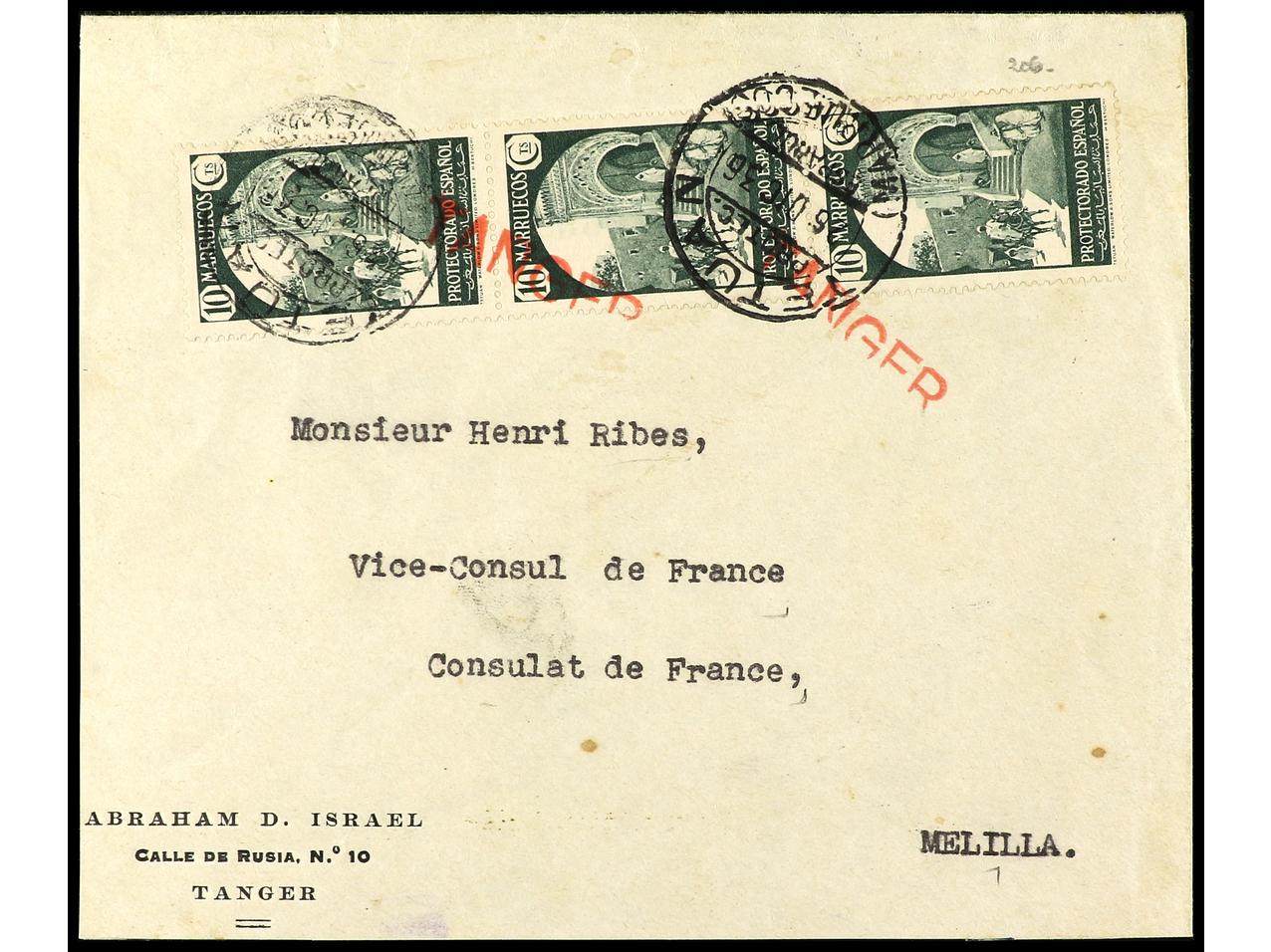 COLONIAS ESPAÑOLAS: TANGER. TÁNGER a MELILLA. 10 cts. verde de Marruecos (3) habilitados TANGER para su uso en la Oficina de Correo de los Nacionales en Tánger al principio de la Guerra Civil. Muy raro uso en carta comercial, ya que la