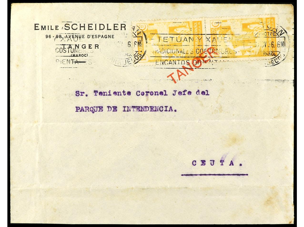 COLONIAS ESPAÑOLAS: TANGER. 1936. TÁNGER a CEUTA. 15 cts. amarillo de Marruecos (2) habilitados TANGER para su uso en la Oficina del Correo de los Nacionales en Tánger al principio de la Guerra Civil. Muy raro uso en carta comercial, ya