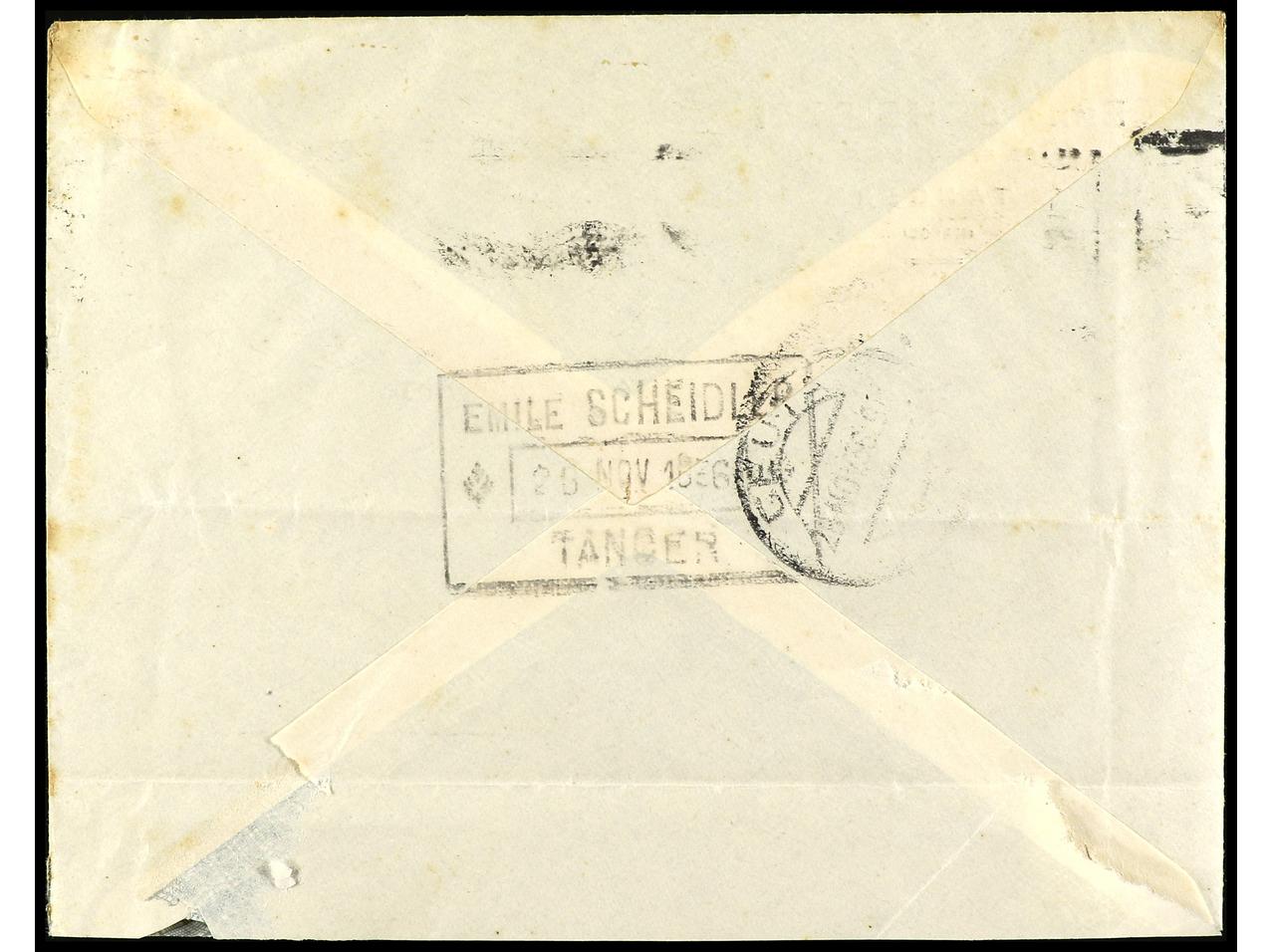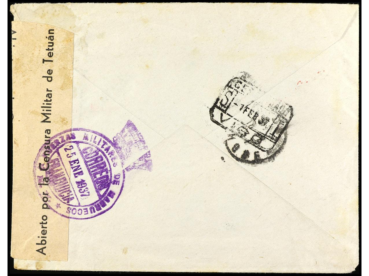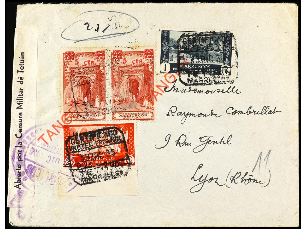 COLONIAS ESPAÑOLAS: TANGER. 1937. TETUÁN a FRANCIA. Circulada con sellos de Marruecos con habilitaciones TÁNGER para su uso por el correo nacional de Tánger, etiqueta de Censura de Tetuán y marca de las Fuerzas Militares de Marruecos.