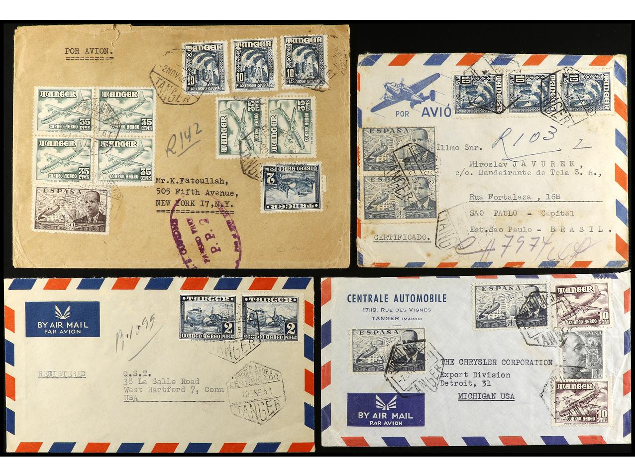 COLONIAS ESPAÑOLAS: TANGER. 1949-52. Conjunto de cuatro cartas circuladas por correo aéreo, preciosos franqueos. (Image1)
