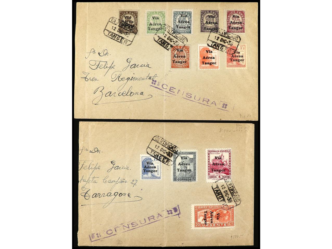 COLONIAS ESPAÑOLAS: TANGER. 1938-39. Conjunto de cartas con sellos habilitados TÁNGER y VÍA AÉREA TÁNGER aparentemente circuladas y con dudosas habilitaciones y matasellos aunque algunas llevan certificado, se venden ´tal cual´ sin