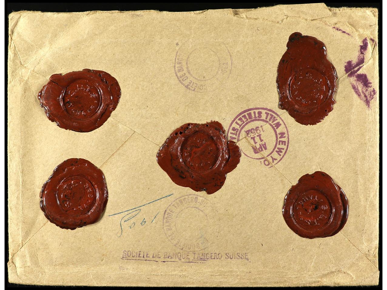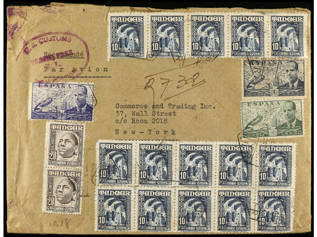 COLONIAS ESPAÑOLAS: TANGER. 1952. TÁNGER a NEW YORK. Carta certificada, excepcional franqueo, al dorso llegada. MUY RARA. Ed.155 (2), 164 (15).
