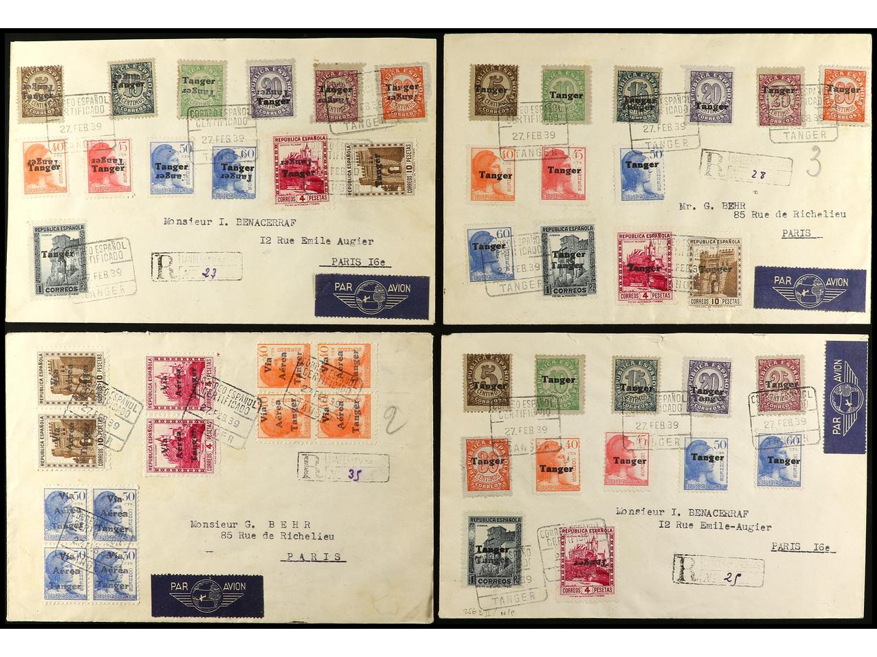 COLONIAS ESPAÑOLAS: TANGER. 1939. Conjunto de cartas con diversos franqueos circuladas a PARÍS, BRUSELAS y BERNA, todas con llegada. Ed.96/107.