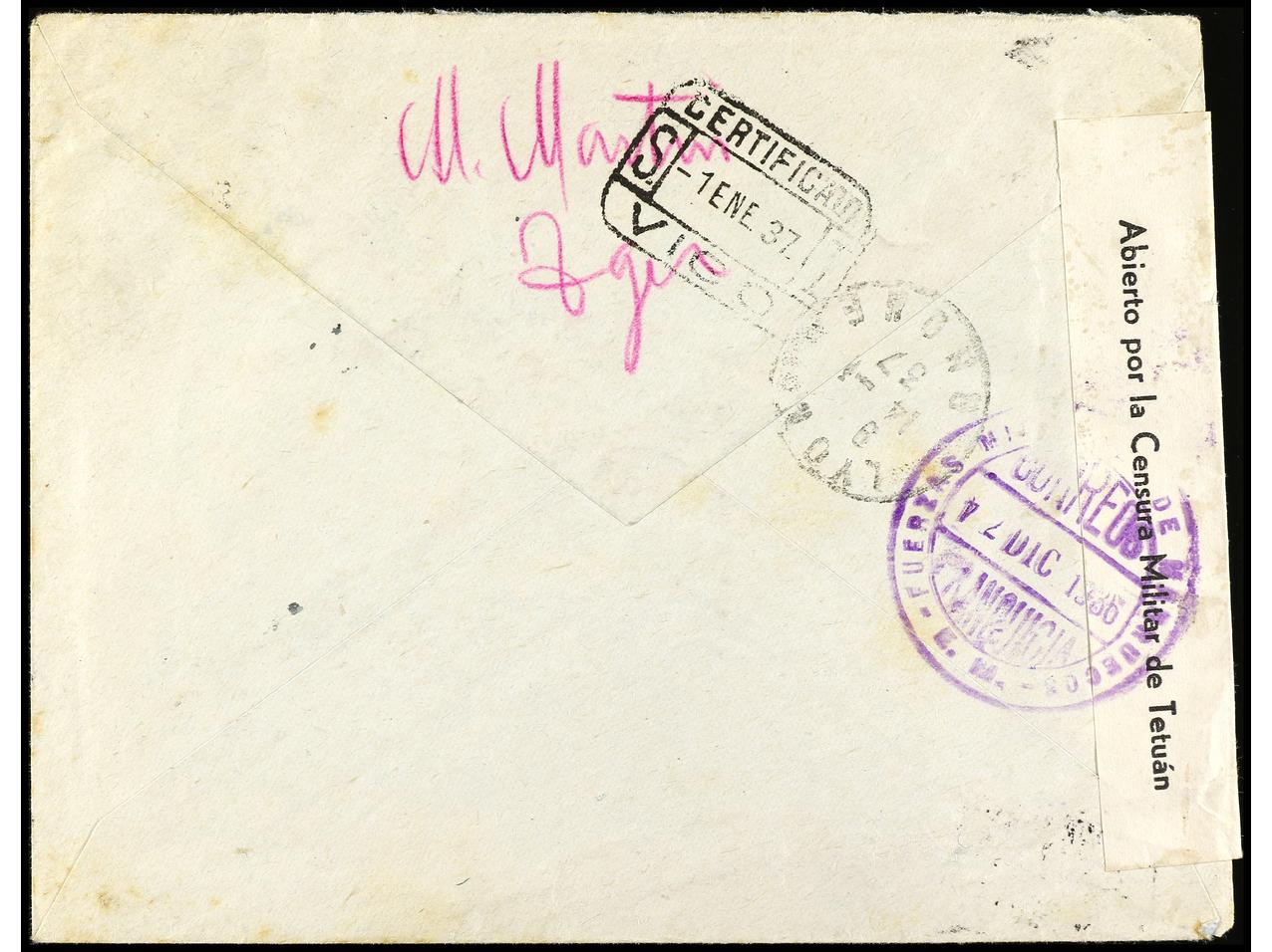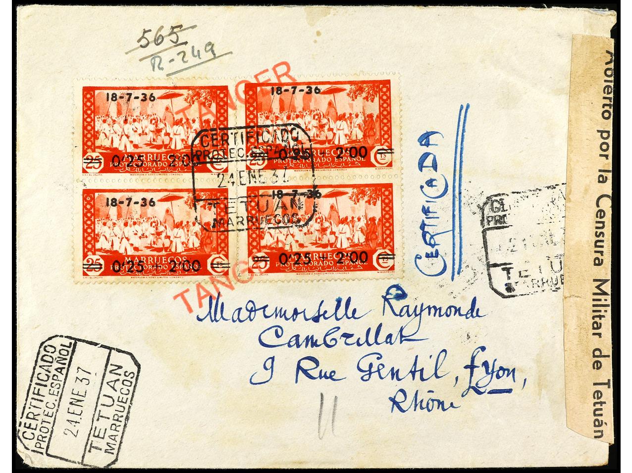 COLONIAS ESPAÑOLAS: TANGER. 1937. TETUAN a FRANCIA. Circulada con sellos de Marruecos con habilitaciones TÁNGER para su uso por el correo nacional en Tánger, etiqueta de Censura de Tetuán y marca de las Fuerzas Militares de Marruecos, al