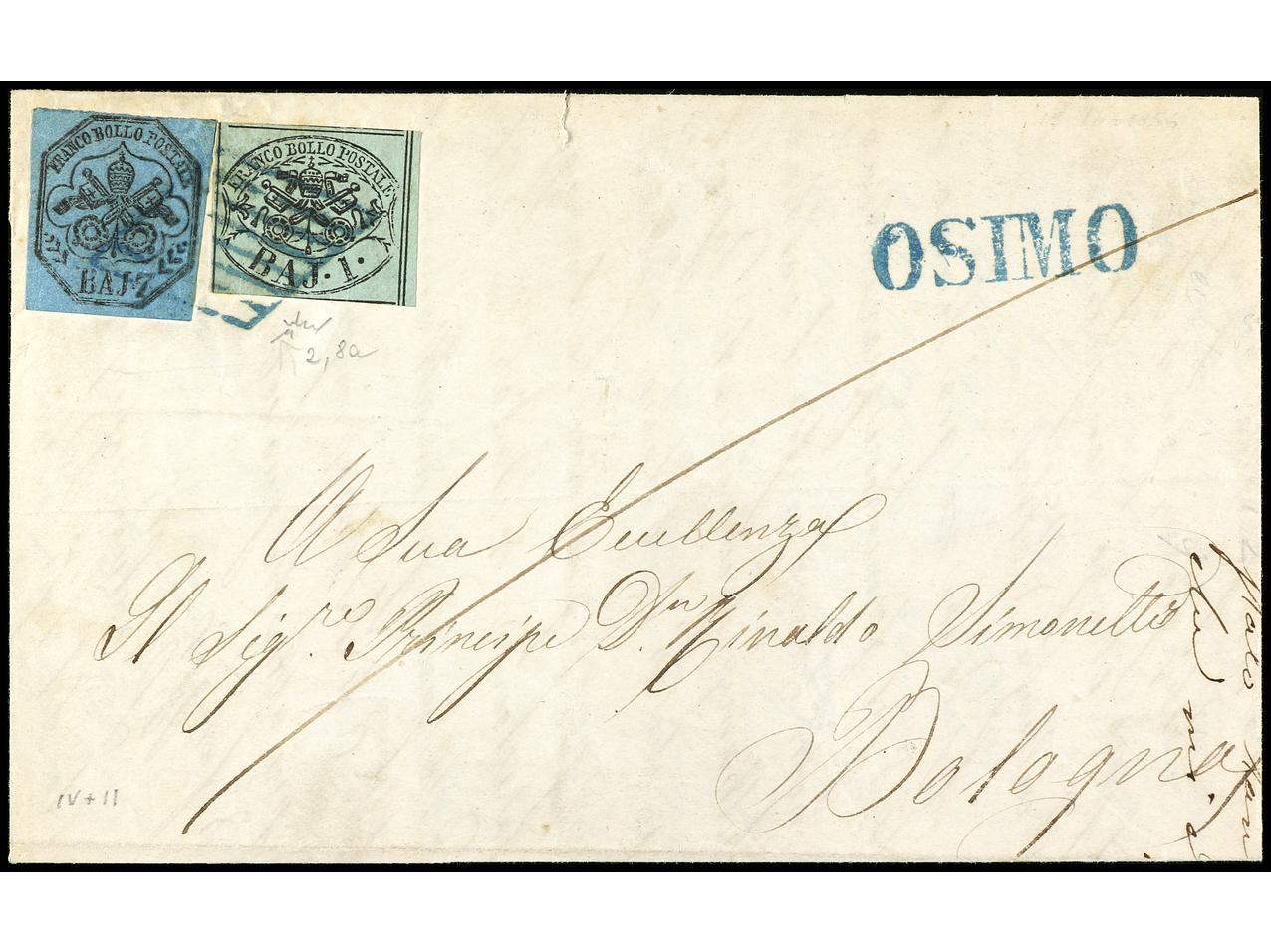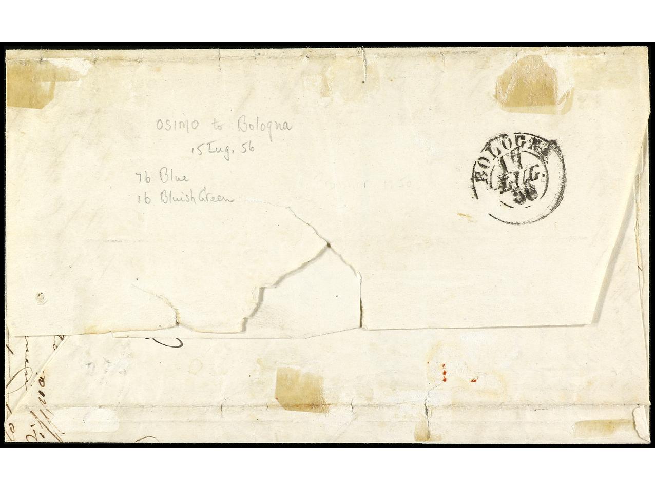 ITALIA ANTIGUOS ESTADOS: ESTADOS PONTIFICIOS. 1856. OSIMO a BOLOGNA. 1 baj. verde y 7 baj. azul, mat. parrilla AZUL y lineal OSIMO. Sa.2, 8a.