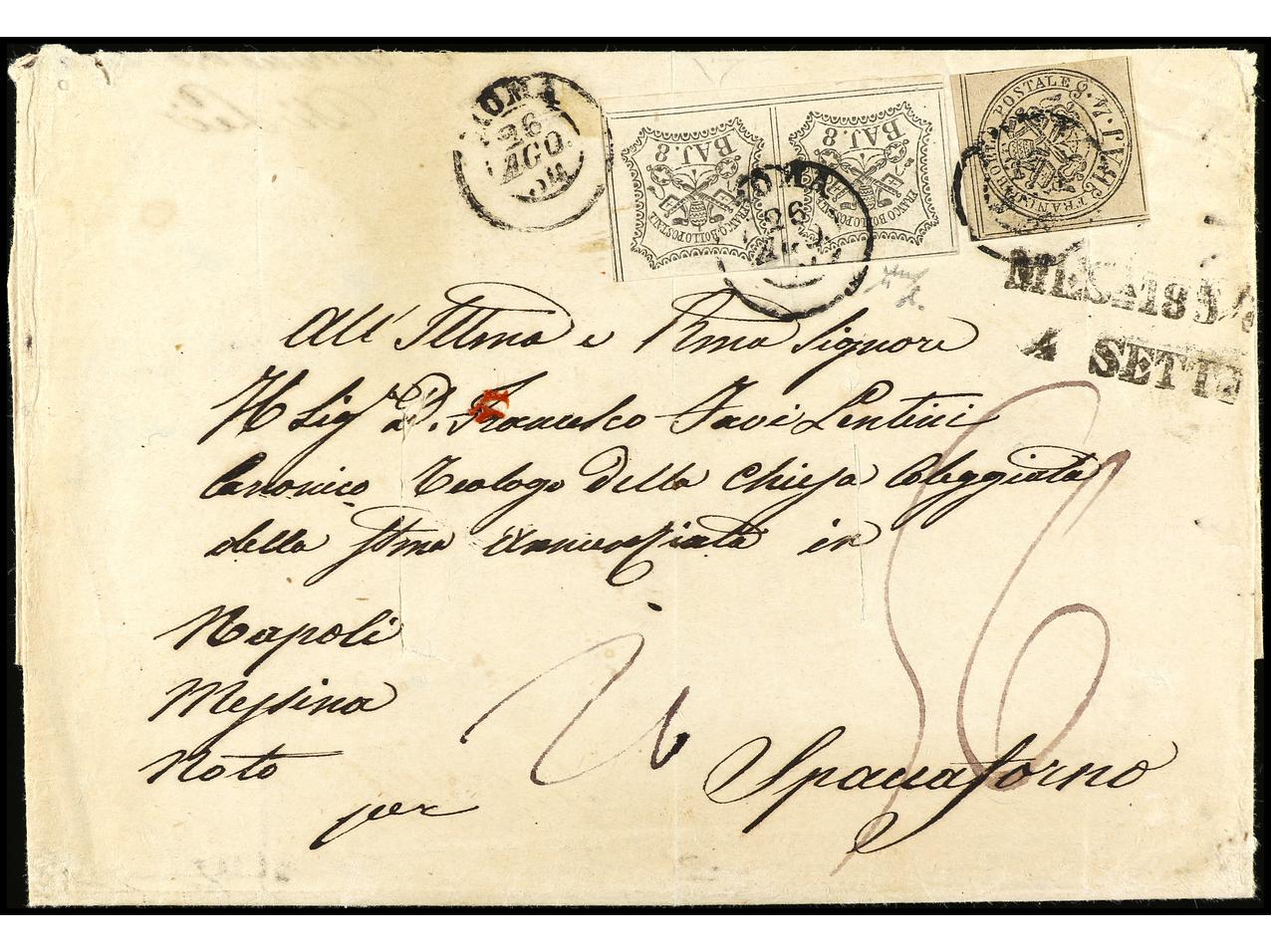 ITALIA ANTIGUOS ESTADOS: ESTADOS PONTIFICIOS. 1855. FRONTAL. ROMA a BARI. 3 baj. bistre (4) y 6 baj. gris ´oleoso´. Sa.4 (4), 7c. (Image1)