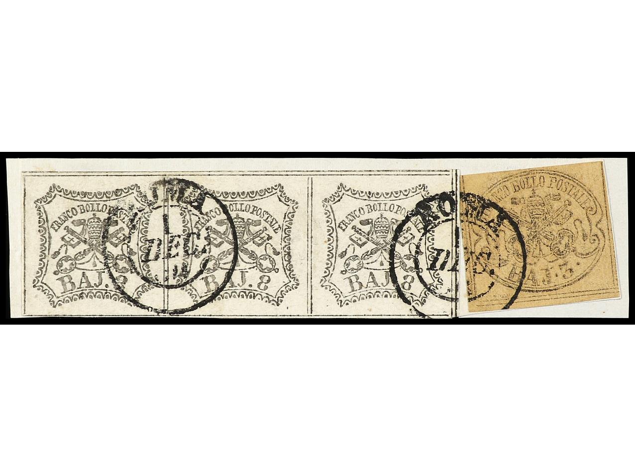 ITALIA ANTIGUOS ESTADOS: ESTADOS PONTIFICIOS. 1854. Fragmento con un 3 baj. sepia naranja y tira de tres de 8 baj. blanco ´oleoso´, mat. fechador de ROMA. Sa.4, 9a (3). (Image1)